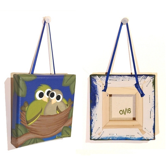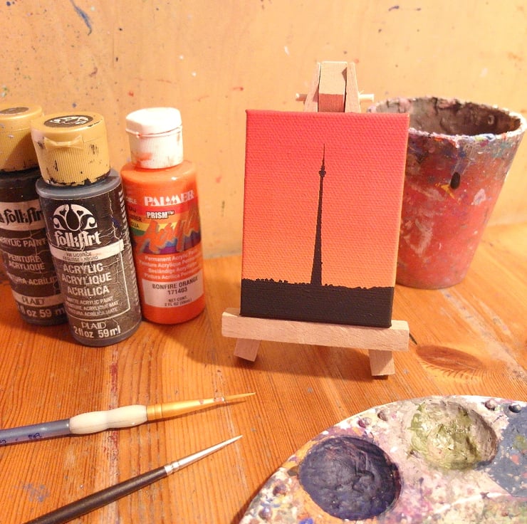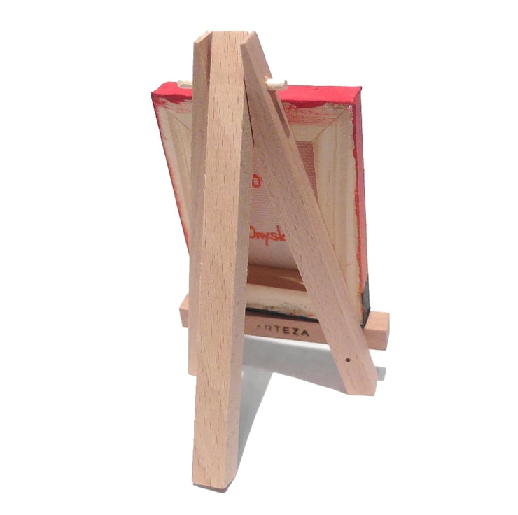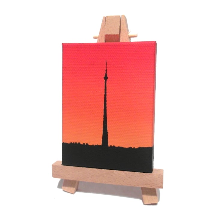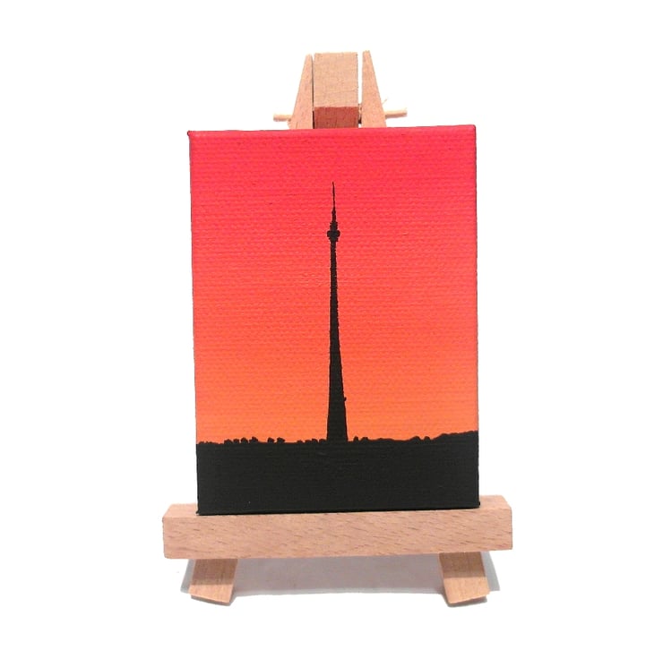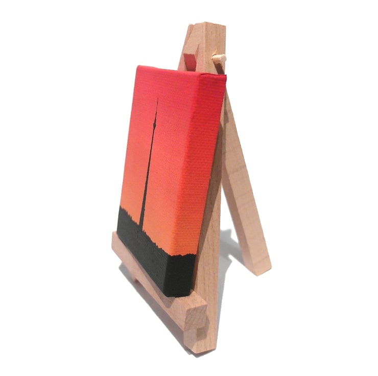The little Emley Moor canvas will either come with a 12.5cm (5") wooden easel for display, or will be strung with a ribbon in a colour that matches the painting so it can be hung on a wall (as in the final photo). Just choose with easel or ribbon hanging when you buy.