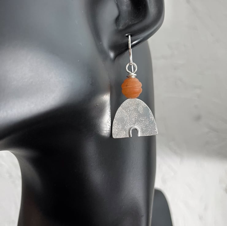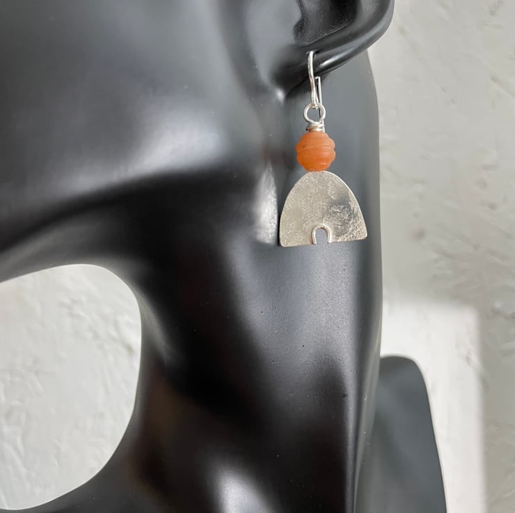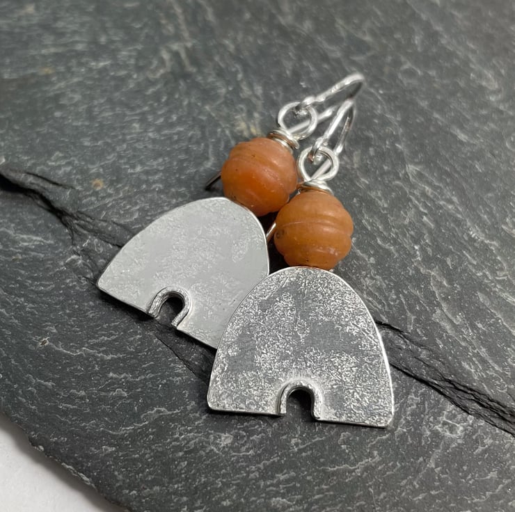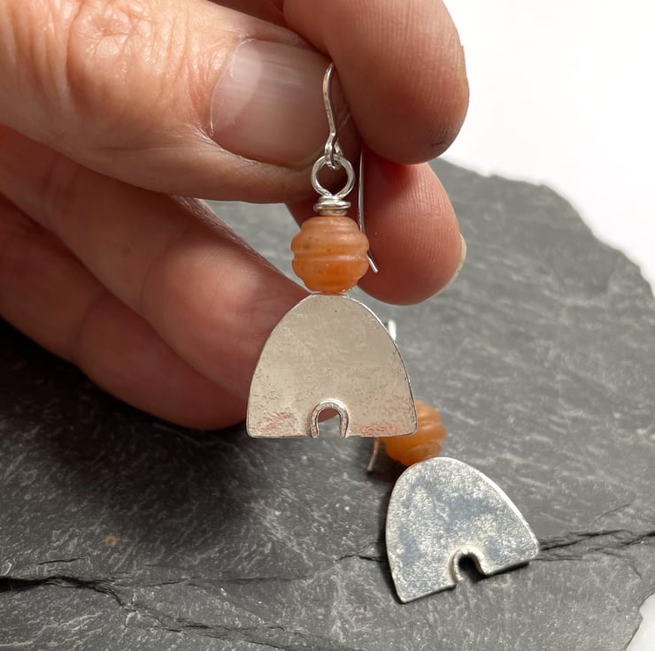Small silver arch shapes have been textured and topped with a pair of frosted orange aventurine beads. I call this design Skep.