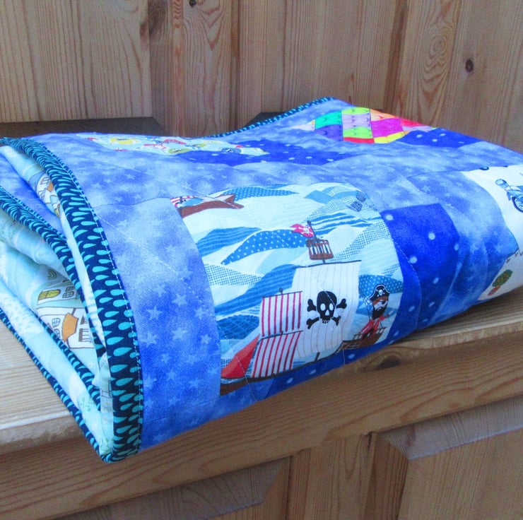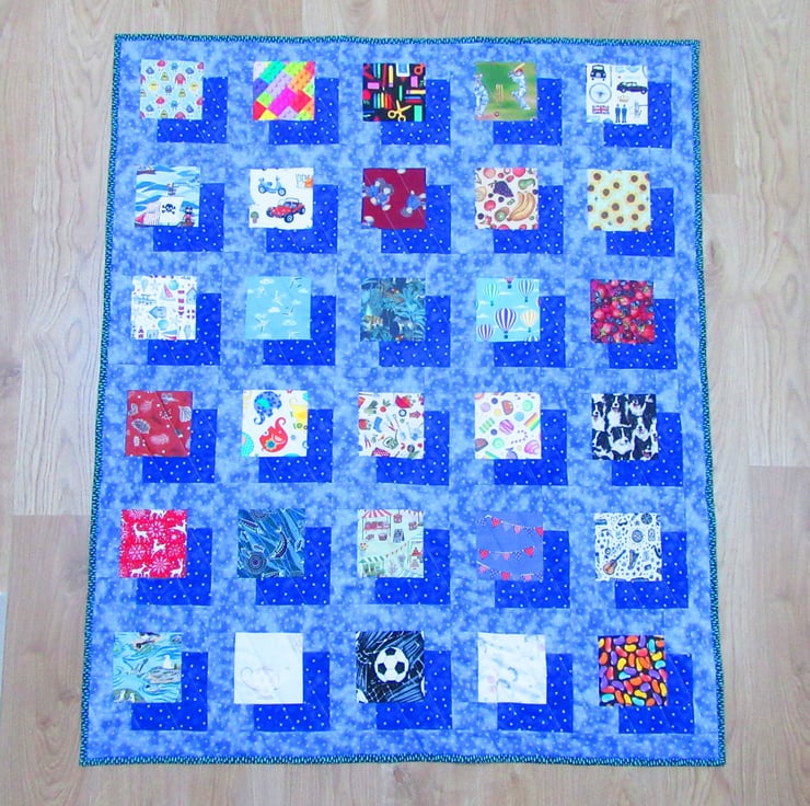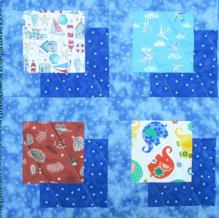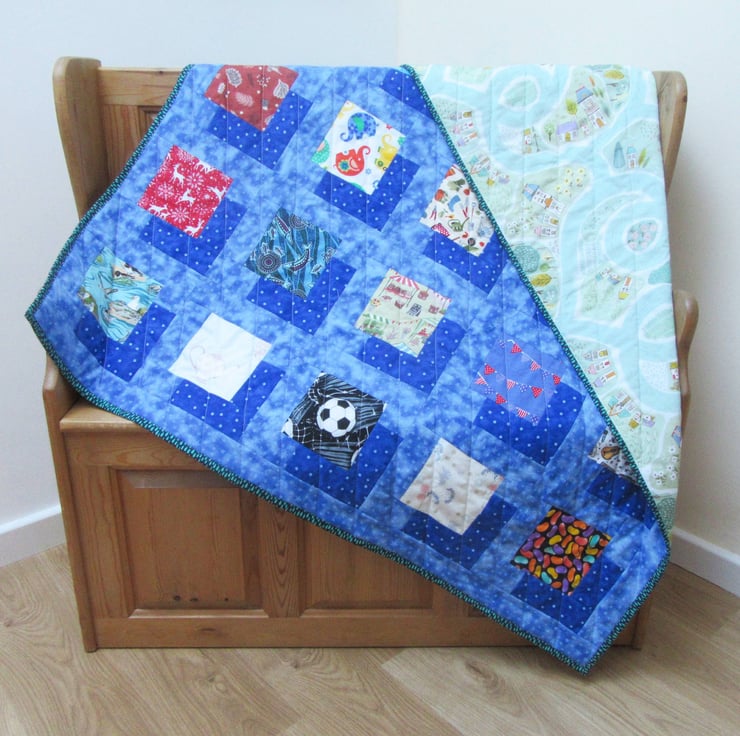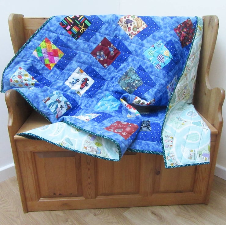 A double sided quilt. On the patchwork side there are thirty novelty squares with pictures of animals, vehicles and everyday items. Great for a game of 'I-Spy with my little eye'.