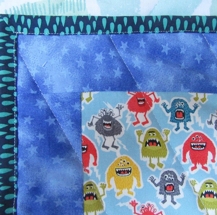 All the outside fabrics are 100% cotton. Inside the quilt is a soft layer of Hobbs 80/20 batting. I have quilted parallel lines of stitching across the quilt. These anchor the three layers (patchwork, wadding and backing) together and give the quilt a soft, cosy feel.