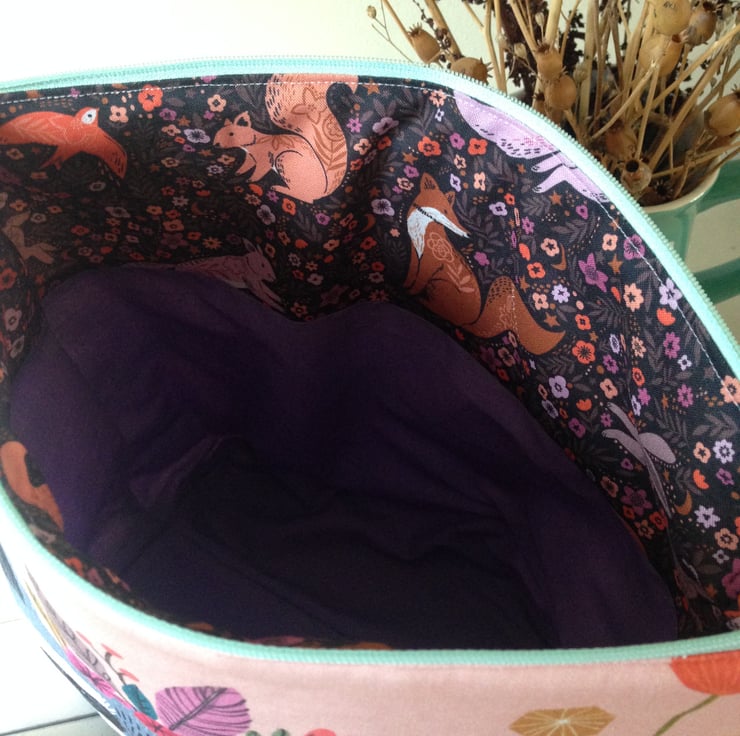 The bag is also lined with a beautiful purple cotton and a woodland animal print.