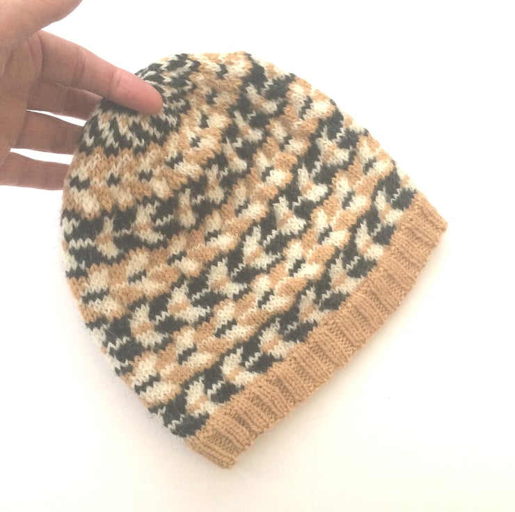 Hand knitted fairisle banie hat. Knit in 100% wool in mustard , black and white depicting arrows going circular round the hat.