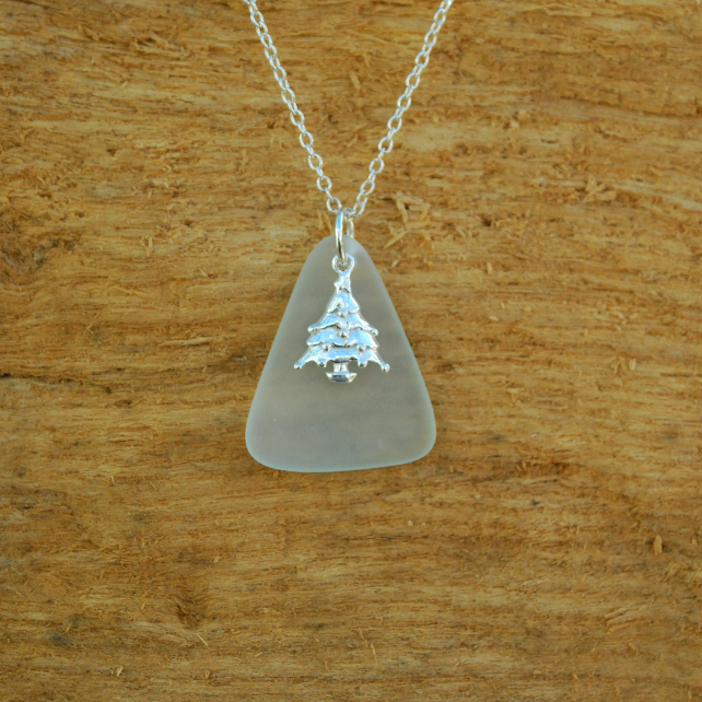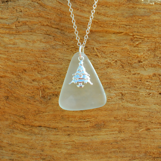 Glass breaks into all kinds of shapes, and this one is perfect for a Christmas tree. The tumbled beach glass is the pale aquamarine colour of old bottles. This colour is typical of the period before colourless glass could be made cheaply. As it has come from a bottle, the glass is gently curved, which we have used behind the pretty sterling silver charm. This is a delightful little Christmas tree pendant, which will look good against lots of different colour clothes.
