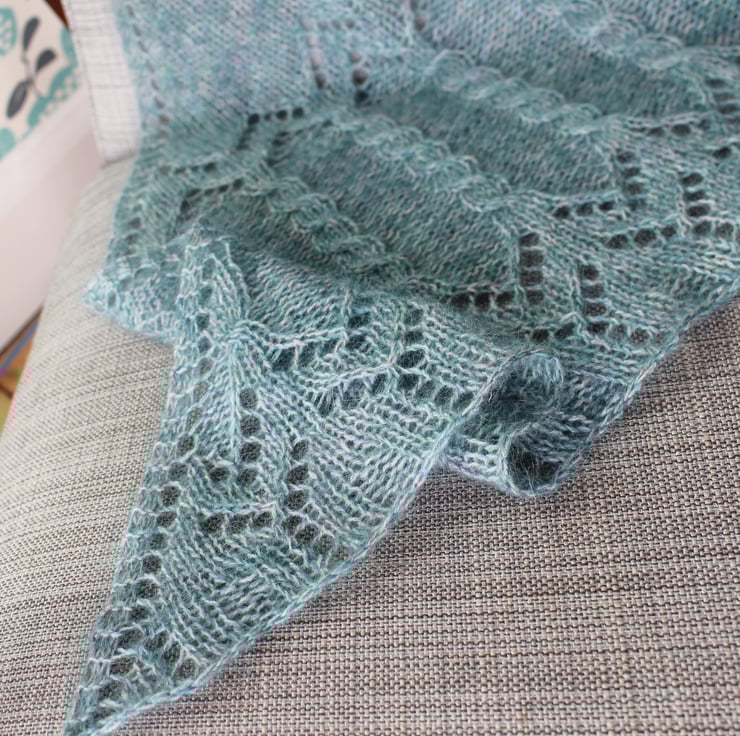 Knitted in two strands of gorgeous laceweight yarn held together, Sycamore is a traditional triangular shawl with a lovely geometric lace and cable section. It's knitted from the top down, starting with an innovative bump-free garter tab.