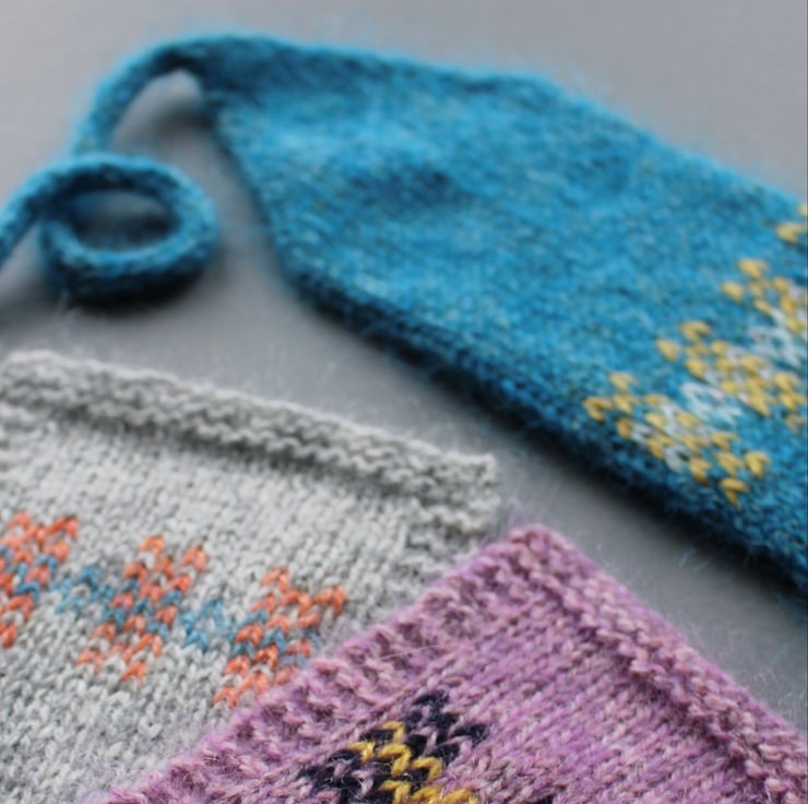 The Clootie Headband is worked in the round, in one piece and the patterning is added with duplicate stitch in two contrast colours.