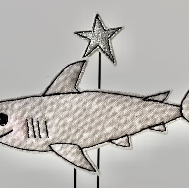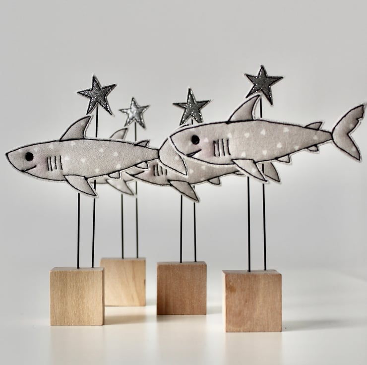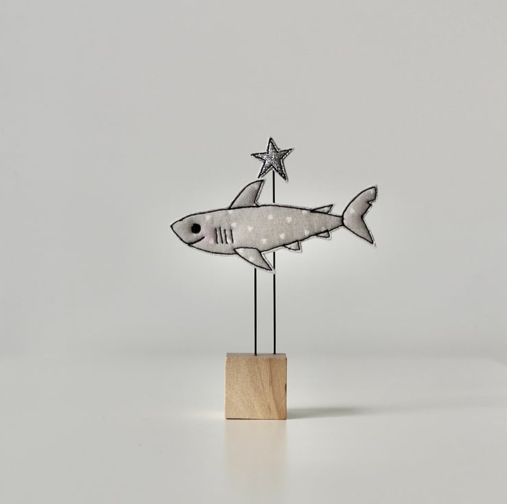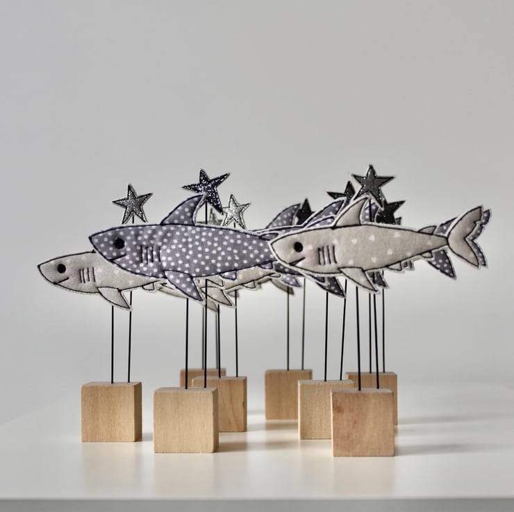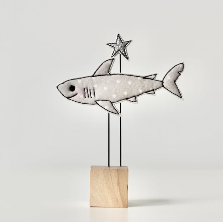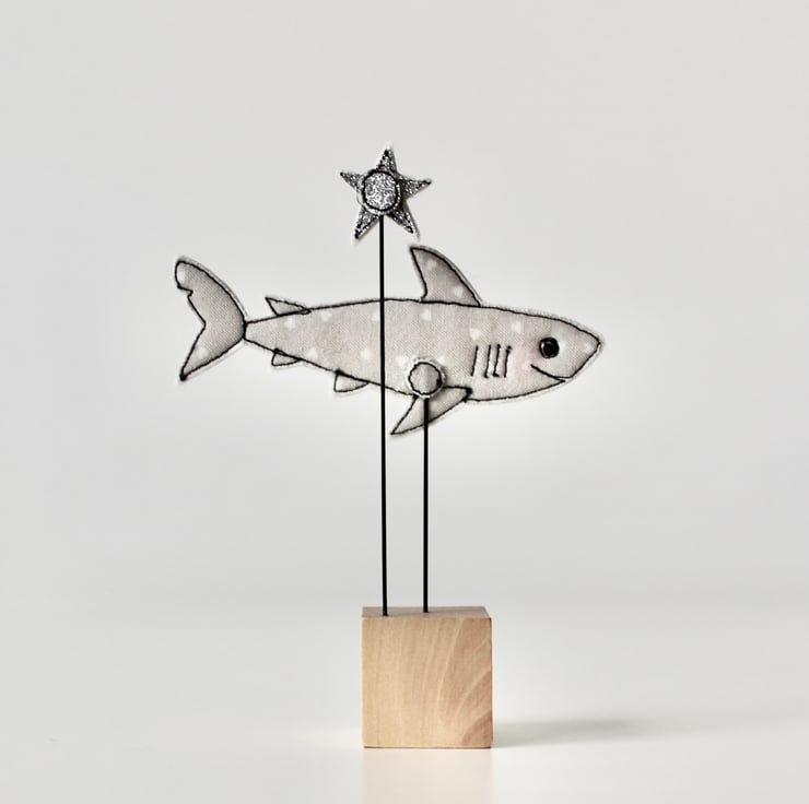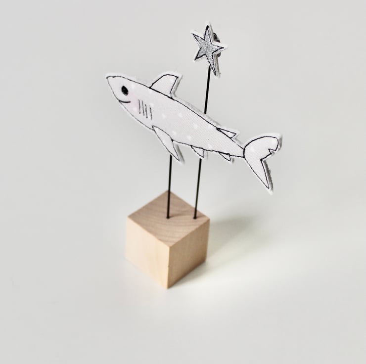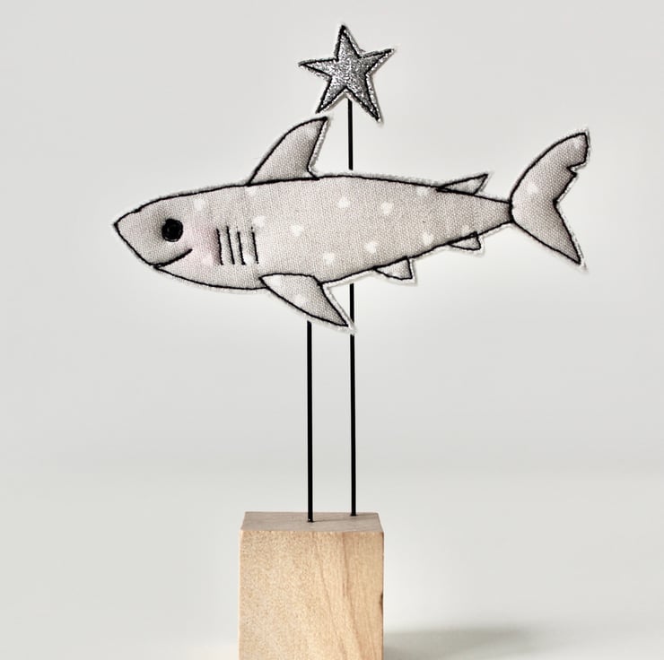 Little shark and the silver glittery star are sewn using 100% wool felt, glitter cloth, grey cotton cloth printed with hearts and free hand machine embroidery; multiple layers of cloth are sewn together and cut out by hand using sharp scissors. Mounted on a 3cm cube wooden block, which can adorn a mantle piece or any flat surface.