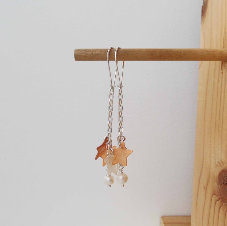 Gorgeous, long with natural shell stars, ivory freshwater pearls and lovely neutral shades on these silver chain drop earrings.