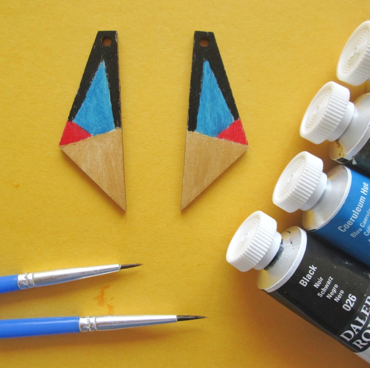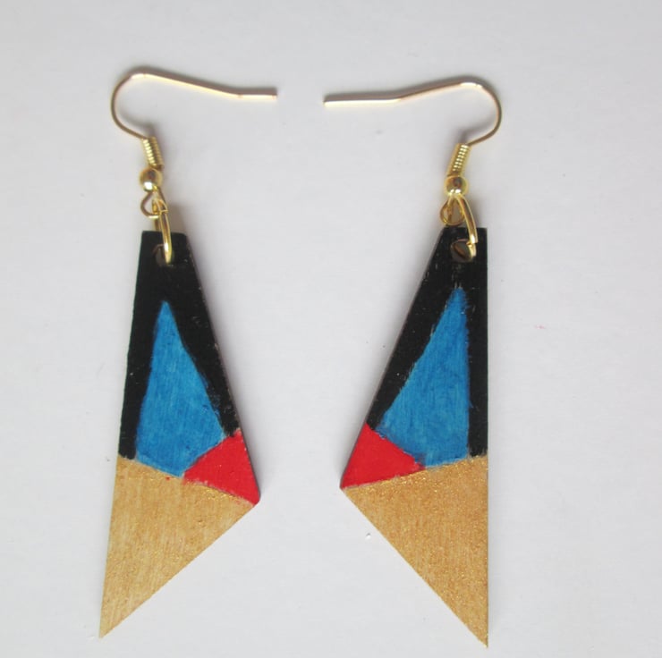A lovely set of earrings ready for her. These art-deco style wooden earrings are hand painted in gold and acrylic paint.