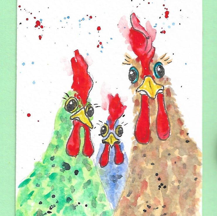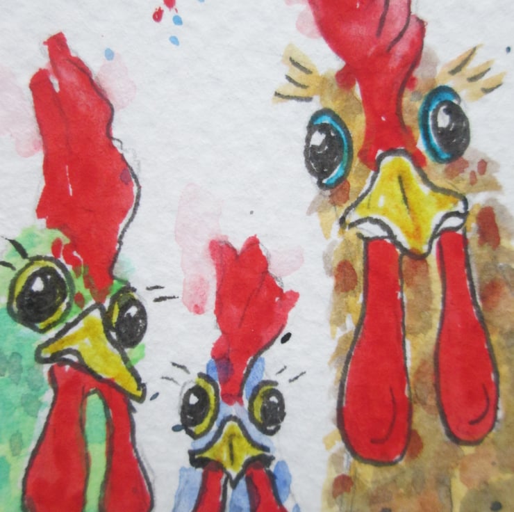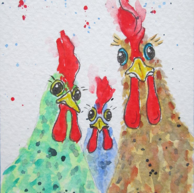 Three cute chickens are painted in watercolours on quality watercolour paper. Accents drawn in ink.
