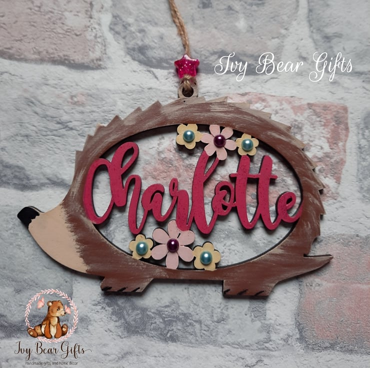 Cute hedgehog wall art featuring name personalisation and an option of adding flowers.