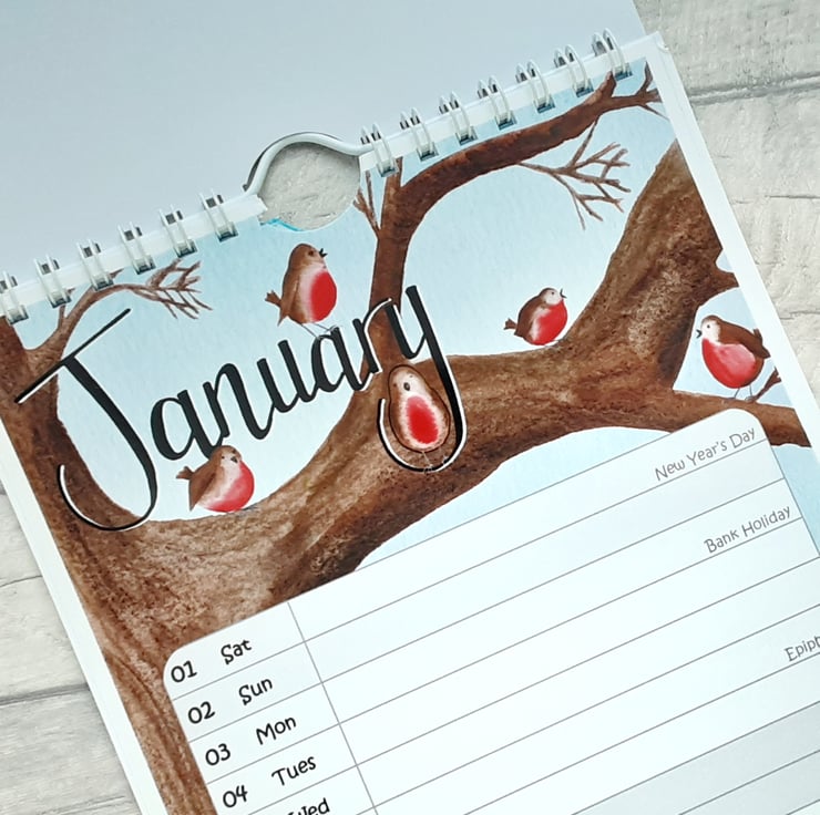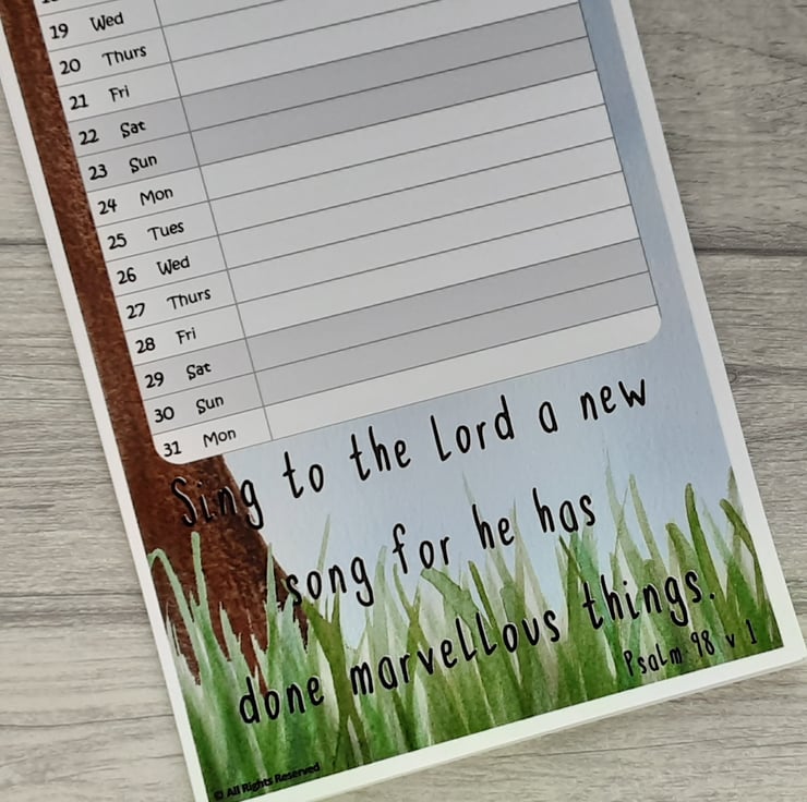 This handy calendar has been designed, painted and printed by me, featuring my own artwork and a bible verse on every page.