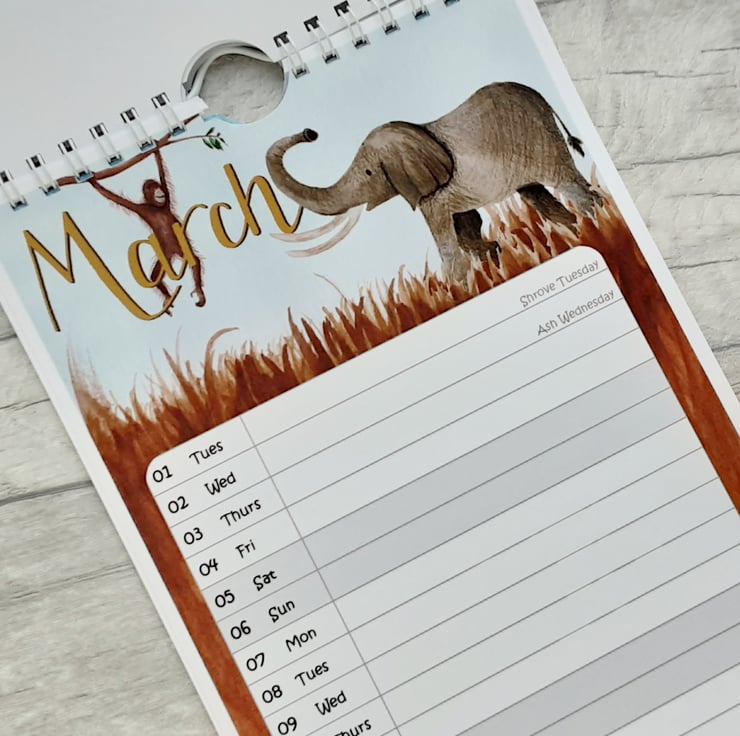The paper is thick with a smooth matt finish enabling you to write easily on the page. the calendars are wire bound with a traditional hanging hook. This calendar is approx 42cm x 15cm when hanging on the wall.