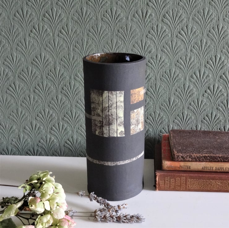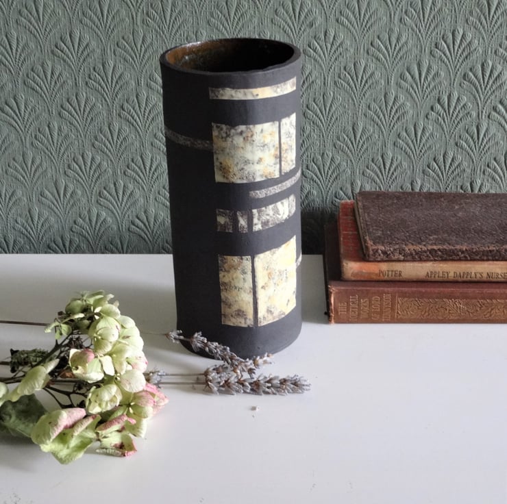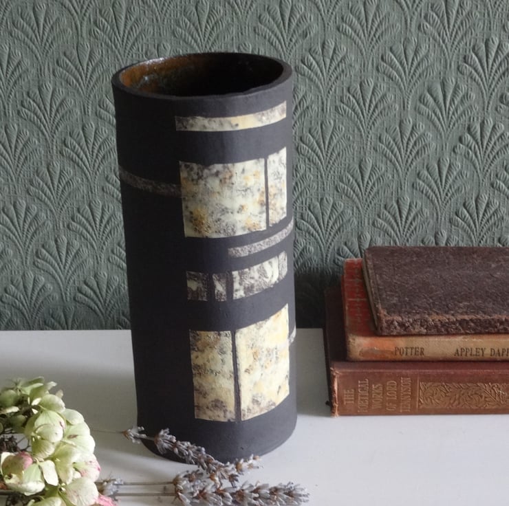 A striking vase for flowers or foliage, or an eyecatching piece of abstract art… I created this black stoneware experimental piece with both ideas in mind. The shape is a loosely cylindrical form, decorated with abstract panels of mingled yellow and lemon, with grey stripes stretching around the form. The different shades of yellow give a dappled effect and contrast with the matt black finish of the natural black clay. The decoration is grouped in two main panels, one on either side of the piece, as you can see in the images. The interior of the piece is glazed in a shiny finish showing lovely and unusual russet tones with blue highlights. Underneath the base you’ll find my potter’s mark of a swallow in flight. The piece stands at approx. 18 cms high, and 8cms diameter at the widest part of the base. A really individual piece of ceramic art that will reflect your own distinctive taste in interior design for your home.
