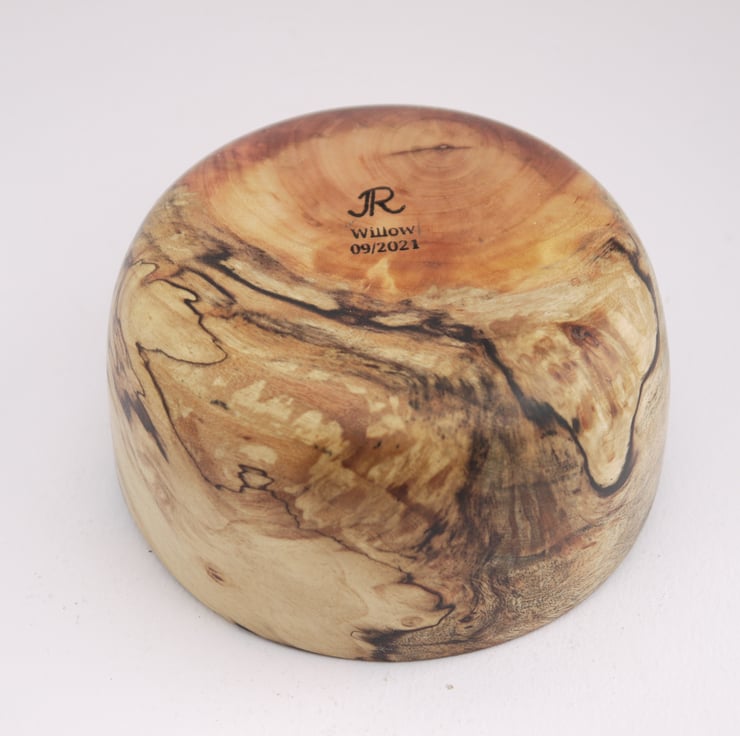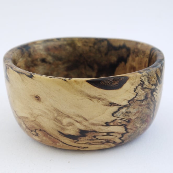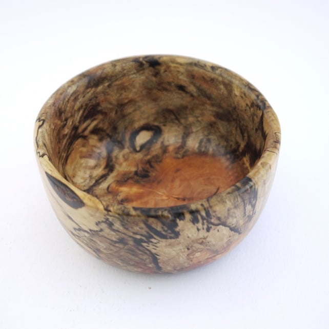 Small bowl made on a lathe from willow. Heavily spalted bowl, with intricate patterns caused by fungal infection. Although suitable for food, this bowl is best used for display to show off the beautiful spalting.