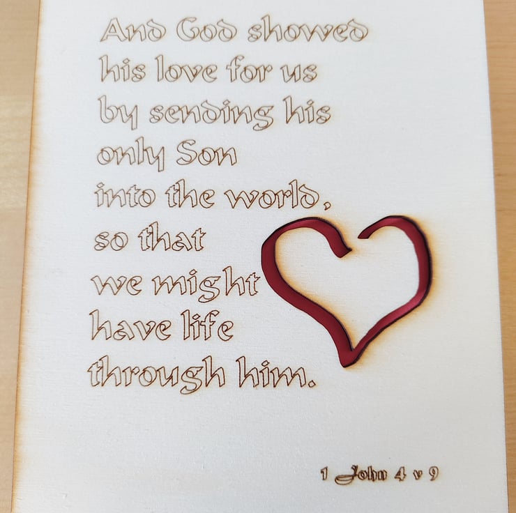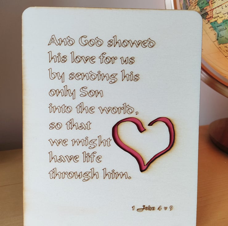 A unique Christmas card wooden laser-cut, heart shape cut out and 1 John 4 verse 9 Bible verse engraved: