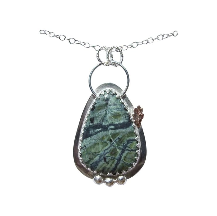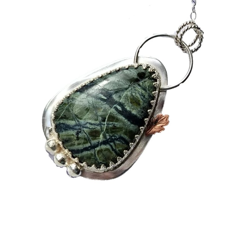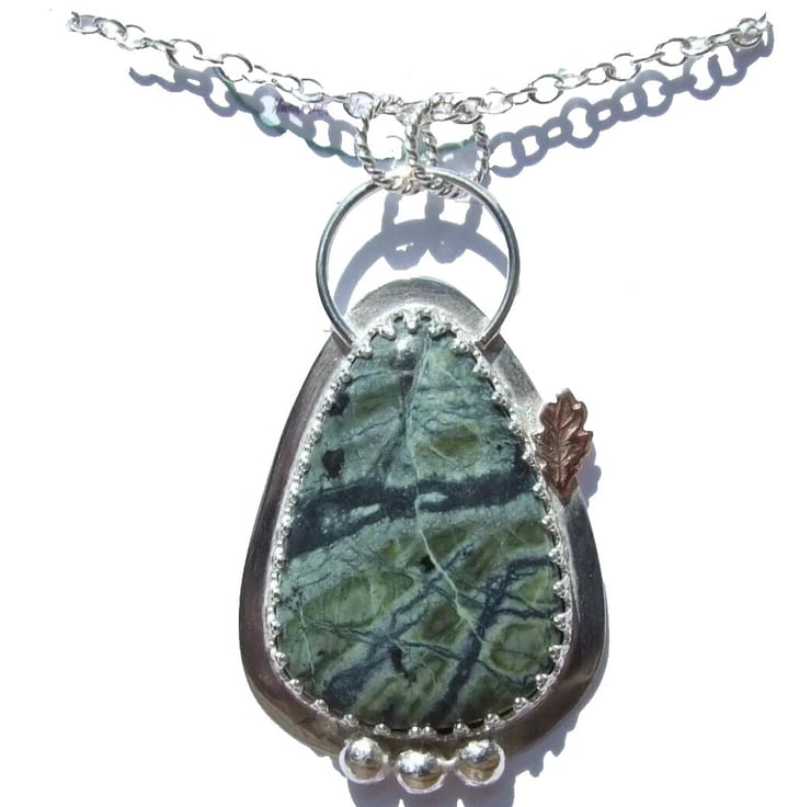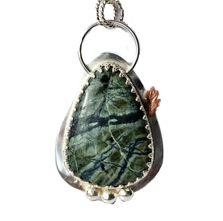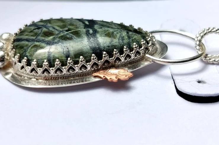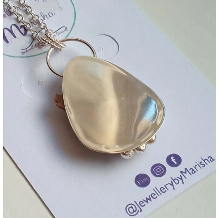 Wrapped in inverted heart design ornate sterling silver, solid Sterling Silver back and twisted loops detail and a little copper leaf for contrast!