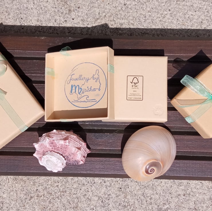 Presented in a recycled, unbleached gift box with mint green shimmery ribbon and "JewellerybyMarisha" logo