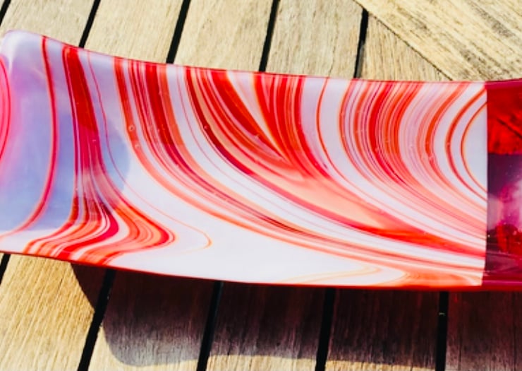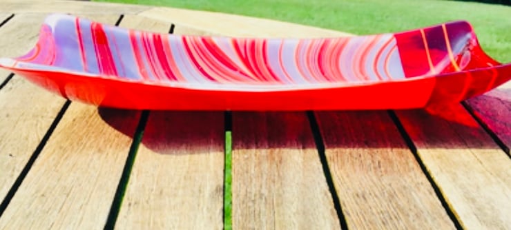 Fused glass long dish in swirl reds . It measures 12 inches x 4 inches and looks stunning as an ornament but can also be used functionally for what ever you like . The glass is all hand made by me and it’s undergoes two separate kiln processes for around 12 hours reach time. Truly a one of a kind functional piece of art .
