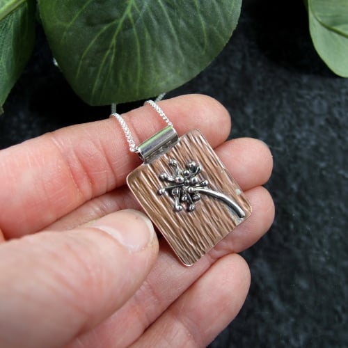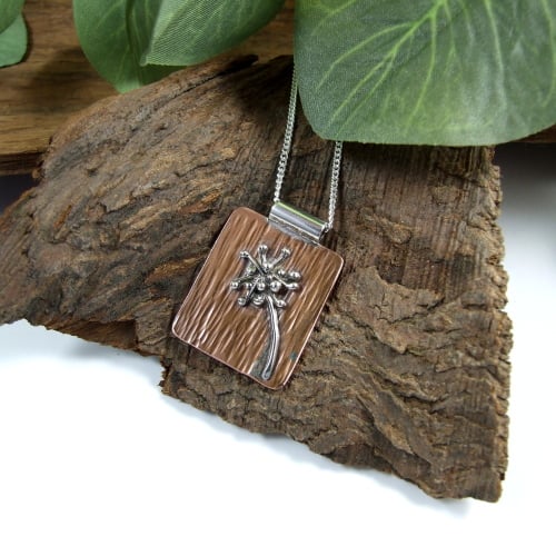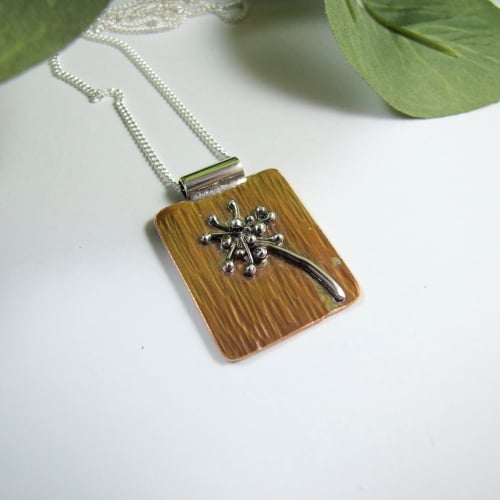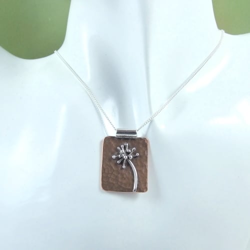 The copper base was cut by hand from 1.2mm thick copper sheet and hammered for a line texture then I soldered on a silver tube for the chain and created the little seed head which is entirely handcrafted from individual tiny bits of silver wire and silver beads all soldered into place. Fitted to 18 inch Sterling Silver Chain