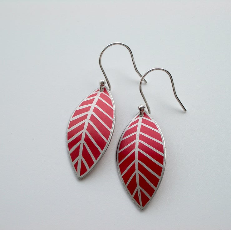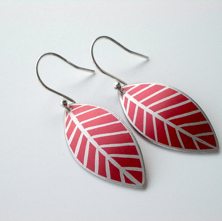 These red leaf earrings are made from anodised aluminium which I have dyed in a pale red and printed with a silver leaf print. I hand cut the leaf shapes using a piercing saw and file the edges to give nice clean lines and smooth edges. Finally, the leaves are domed slightly so that they catch the light nicely. The leaves measure approximately 27mm x 13mm and hang from sterling silver ear hooks.