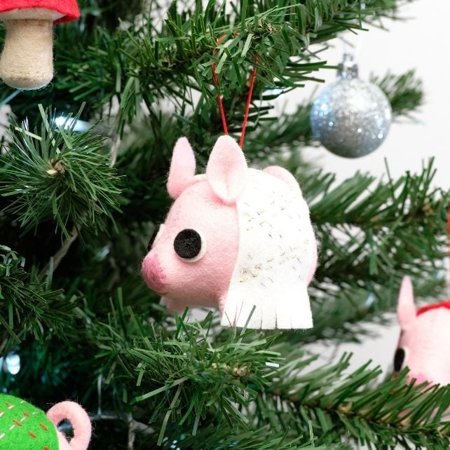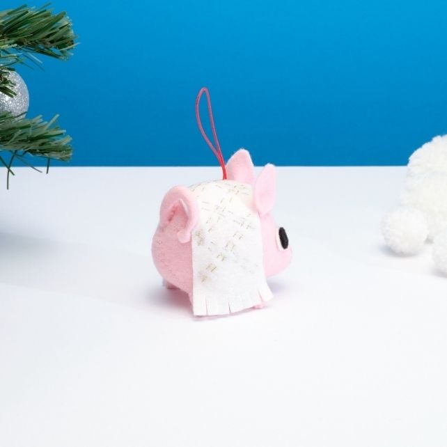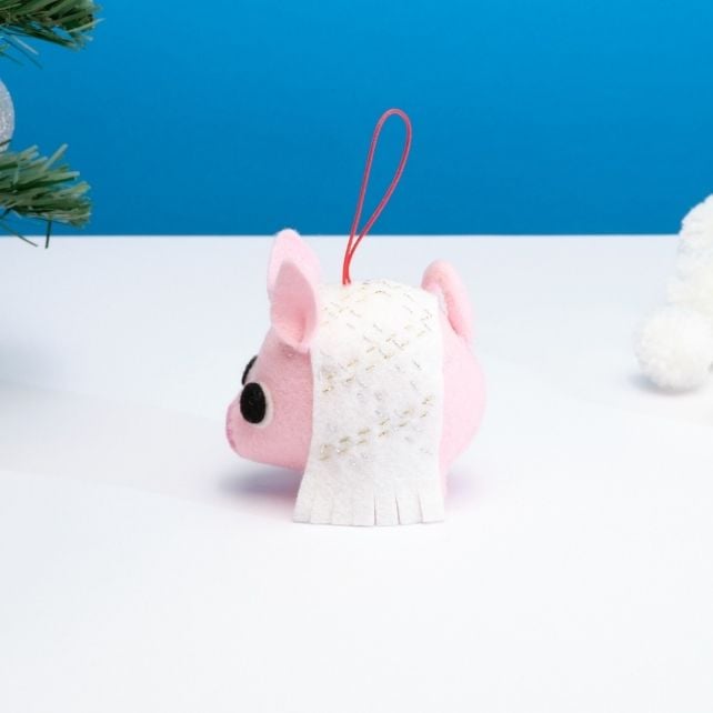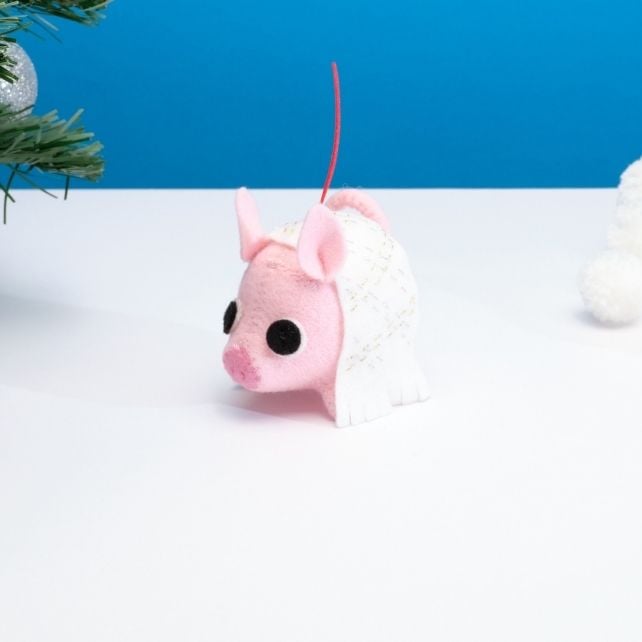 This super cute piggy is perfect dangling from your tree, a hook or wherever you’d like to see it’s sweet smile. It is keeping cosy and warm in it’s white blanket which is embroidered with silver and gold thread.