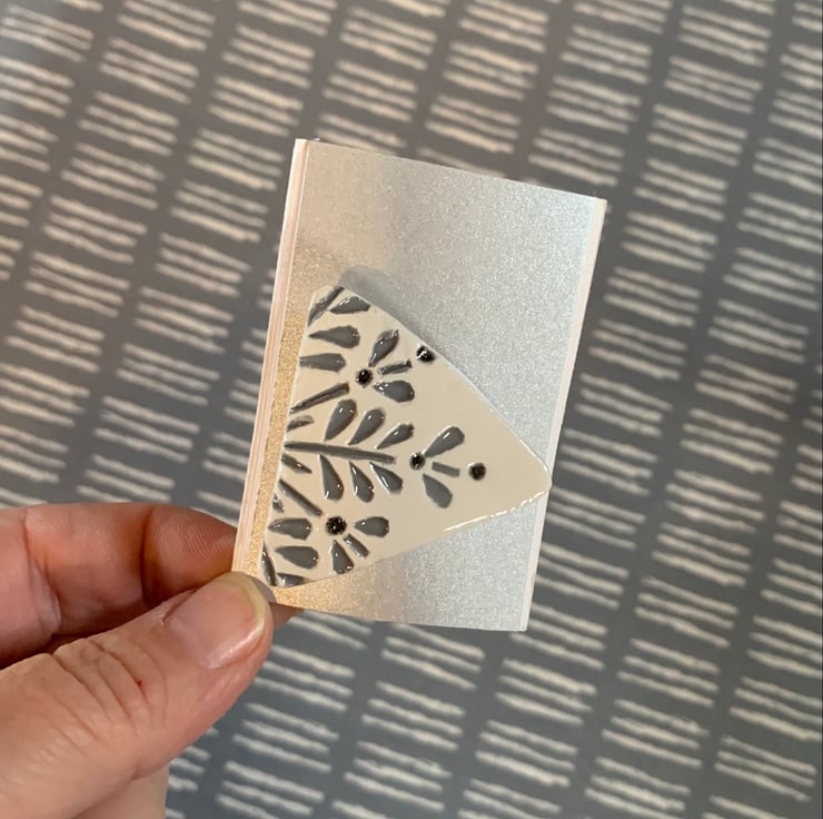 Made from white earthenware clay, this textured brooch is handmade from start to finish. Initially the patterned texture is applied to the surface of the clay using a snowflake wooden block. The triangular shape of the brooch is formed with a metal cutter. Each piece is then air dried for several days before being kiln fired to form bisqueware.