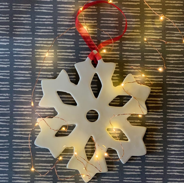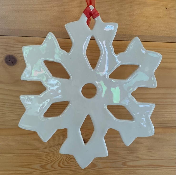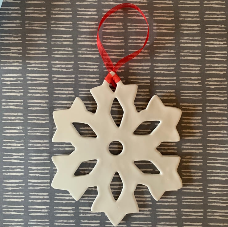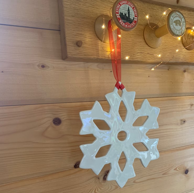 This giant ceramic snowflake decoration has been handmade using white earthenware clay making each one completely unique. The clay was rolled flat before being cut with a giant snowflake cutter. The clay was left to dry naturally before being kiln fired for the first time. After this initial bisque firing the snowflake was dipped in a glossy glaze before being kiln-fired for the final time. It is then strung together with a vibrant red organza ribbon, ready to adorn your festive home.