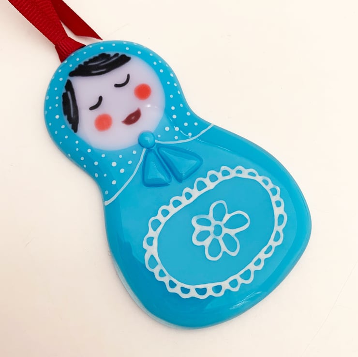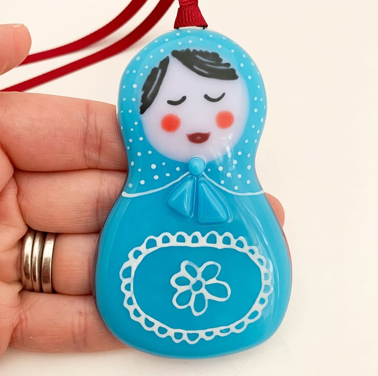 Fused glass hanging Matryoshka Doll inspired decoration. Featuring hand painted decoration and a red hanging ribbon. These Christmas decorations make wonderful small gifts and look lovely when hung on a Christmas tree.