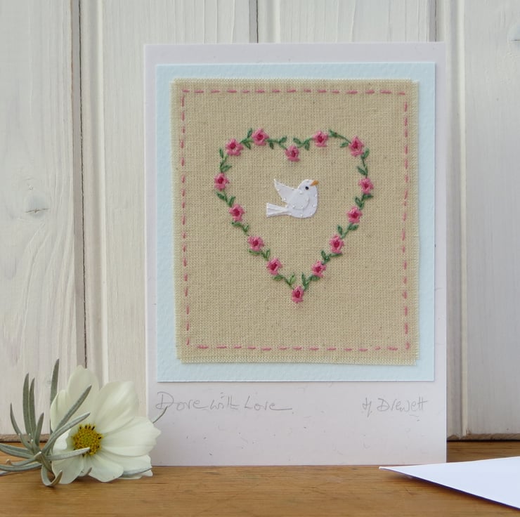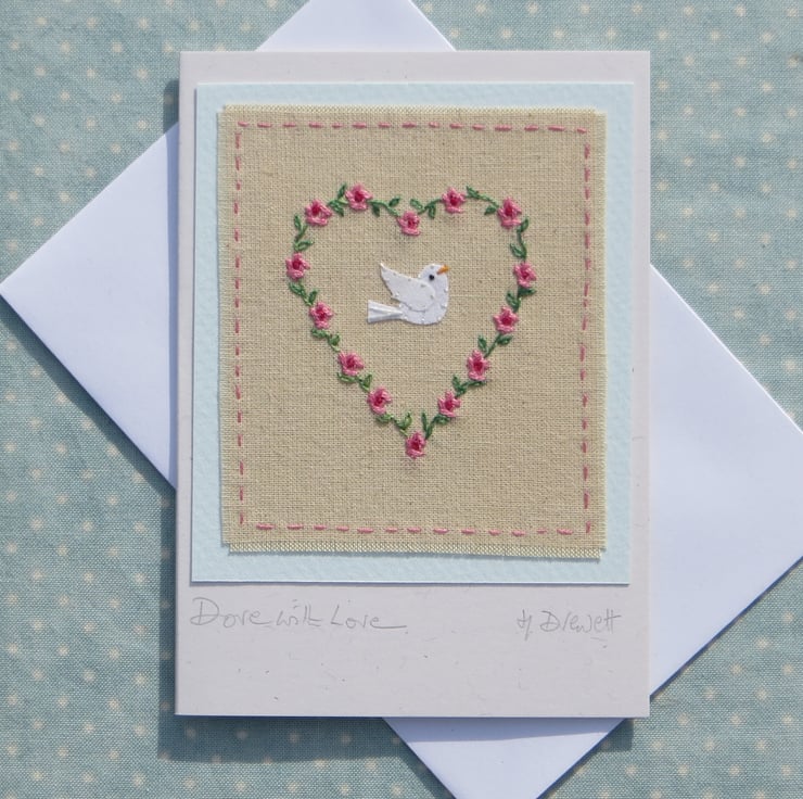 A hand-stitched miniature mounted onto greeting card, with title written beneath: Dove with Love. This carefully worked embroidered miniature is a gift in itself as well as a card in which to write your message - a card to keep. I have embroidered a heart shape of roses and leaves and added a tiny dove in the centre. Delicate and precious-looking, perfect for any special time.