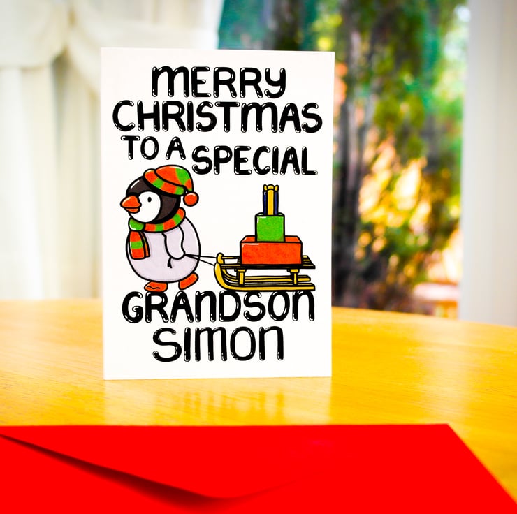 Greeting on front: MERRY CHRISTMAS TO A SPECIAL GRANDSON (NAME)