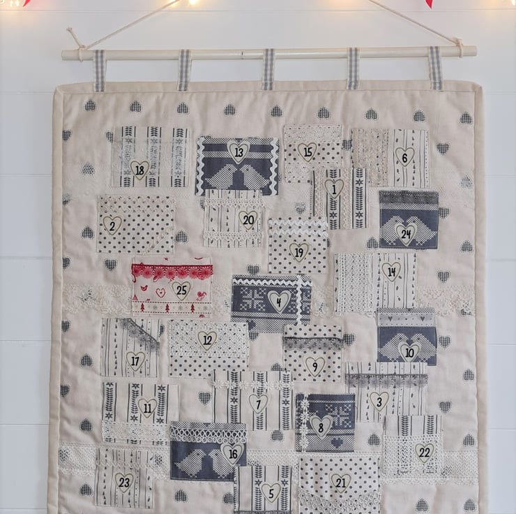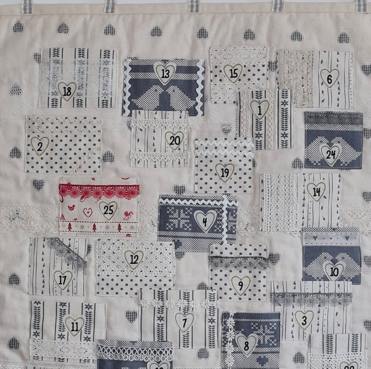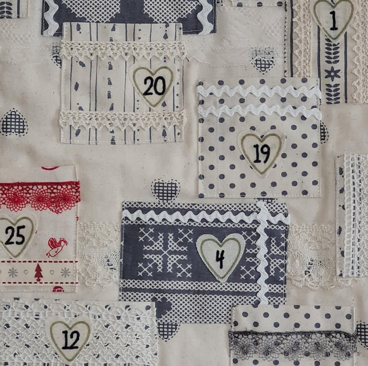 A simple colourway with Scandi design fabric works beautifully with the lace and ribbon trimmings on this advent calendar. All the fabrics are cotton calico giving it a natural feel. The numbers for each pocket are printed in gold edged calico hearts.The calendar measures approx 23 inches/58 cm long and 20.5 inches/52 cm wide. The pockets have plenty of room for all sorts of treats!