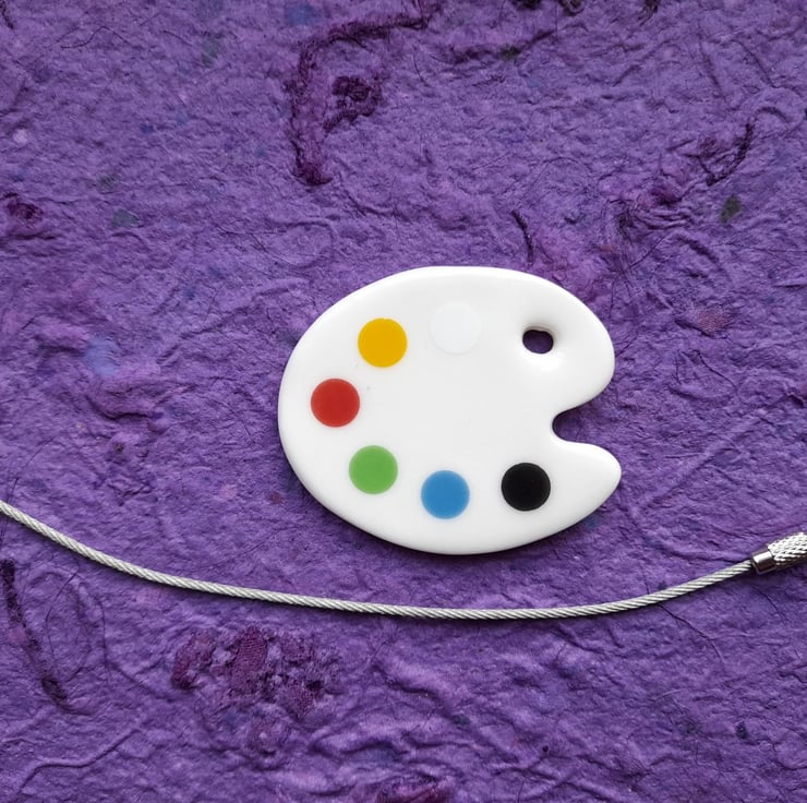 The ceramic paint palette is individually cut from a rolled piece of porcelain clay. It measures approximately 6cm by 4.5cm by 3mm thick. It has been fired three times in the kiln, the last decal transfer firing is for the circular spots of colour. The reverse is unglazed and has a slight linen texture. The wire loop which screws into itself measures 15cm long when undone and about 5cm diameter when screwed together. Supplied in a pretty organza bag and a red plastic key. Please be aware that the item is ceramic and if dropped at height on a hard surface it may break! Posted unassembled to reduce postage costs.