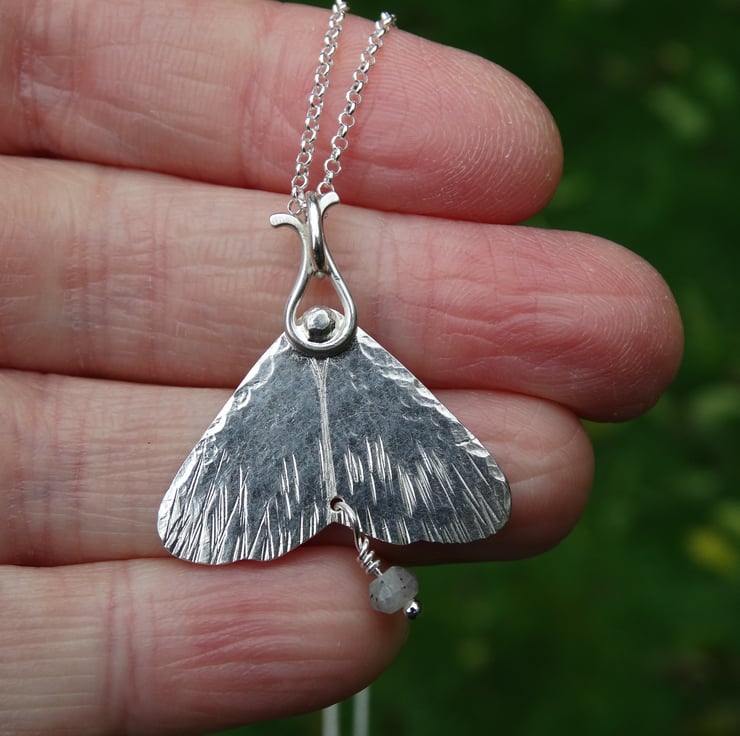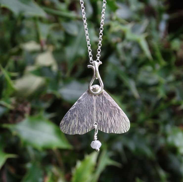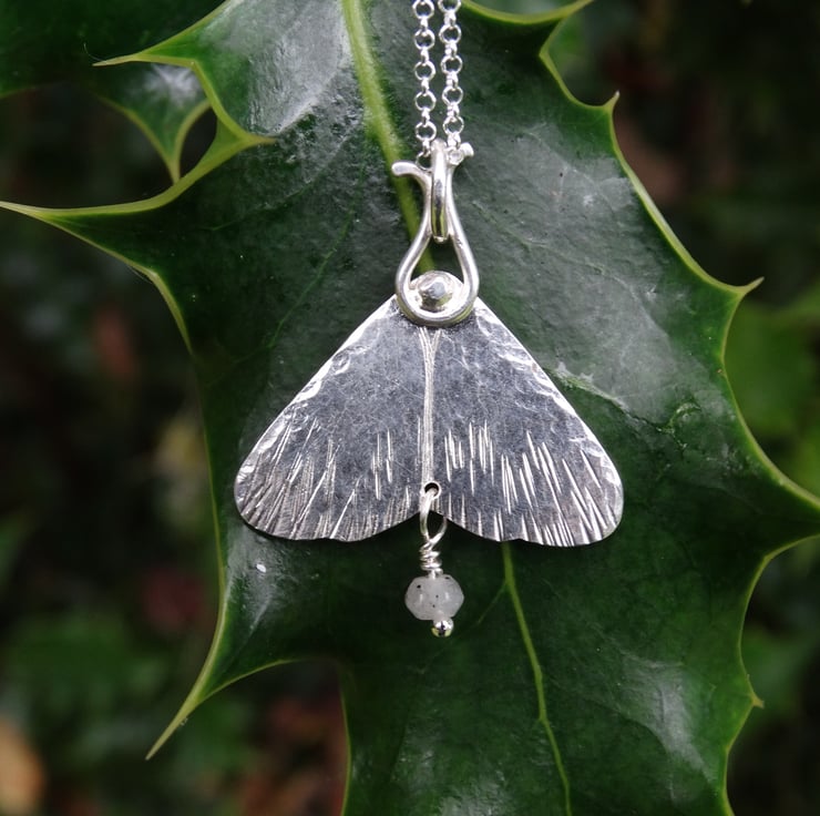 Each of my moths is drawn by hand before being cut out from Eco Silver sheet using a jeweller's saw. The silver is textured all over using a hammer, and I solder on the little embellishments which are made from Eco Silver wire and melted scrap silver. Further details are added by hammering, punching and engraving by hand, and this design also features a tiny faceted dendrite opal bead.