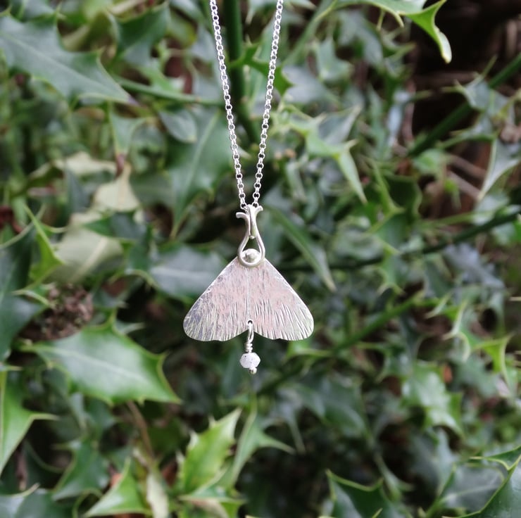 I began making moths in silver inspired by the Scarlet Tiger moths that appear in our garden around the time of the summer solstice each year. I loved making these “midsummer moths”, and they proved popular, so imagine my delight when I found out some species of moth are active during the winter months! This particular design is inspired by the Winter Moth, and I make others inspired by the December Moth.