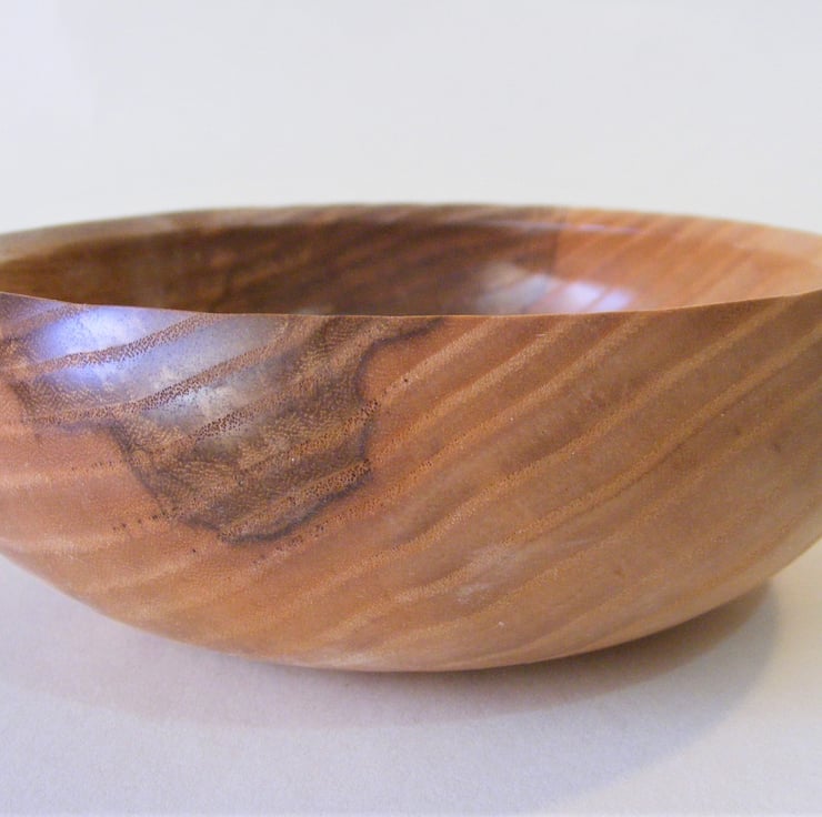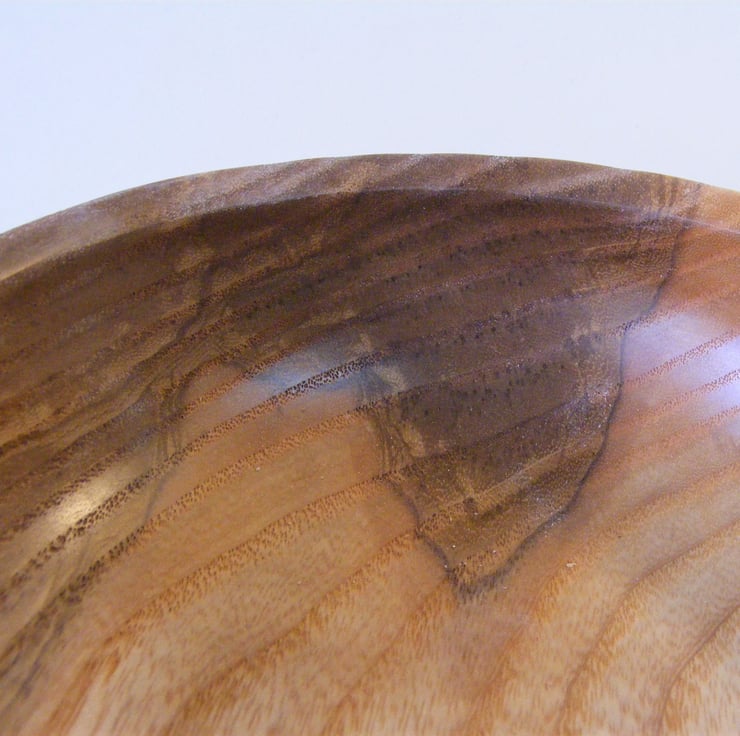 Spalted Ash bowl, 148 x 52mm, finished in food safe Danish oil. A nicely curving bowl with a closed form shape and and in sloping rim. It has very clear grain lines and a nice warm colour, down one side in a darker area of spalting/colouration from natural processes in the timber. It would make a nice bowl for nibbles, sweets, dry food or salads.