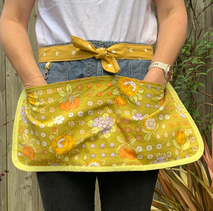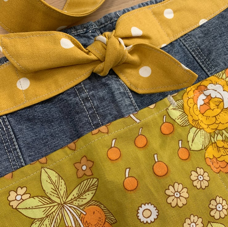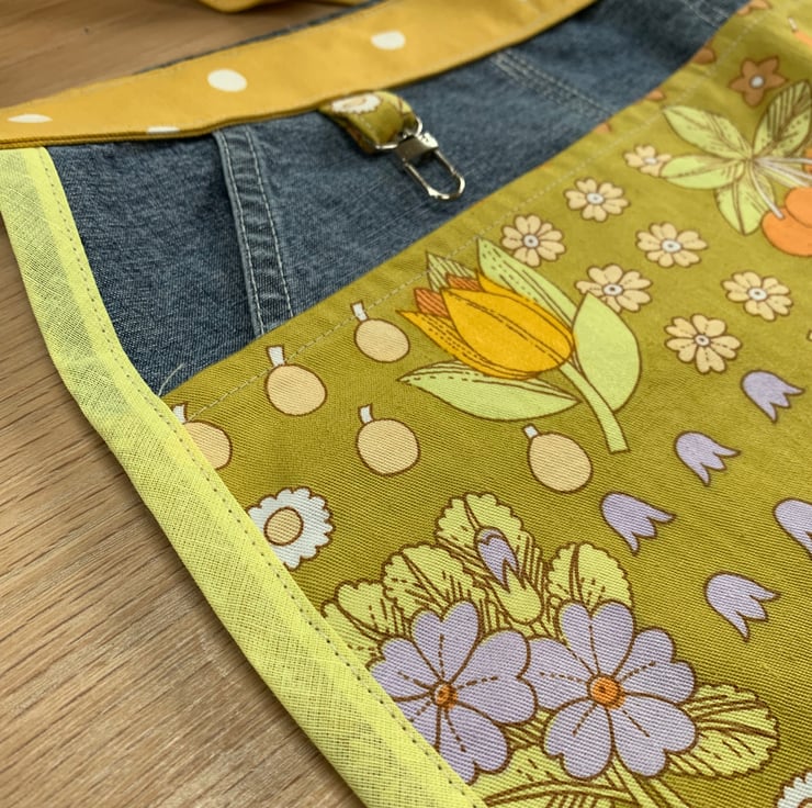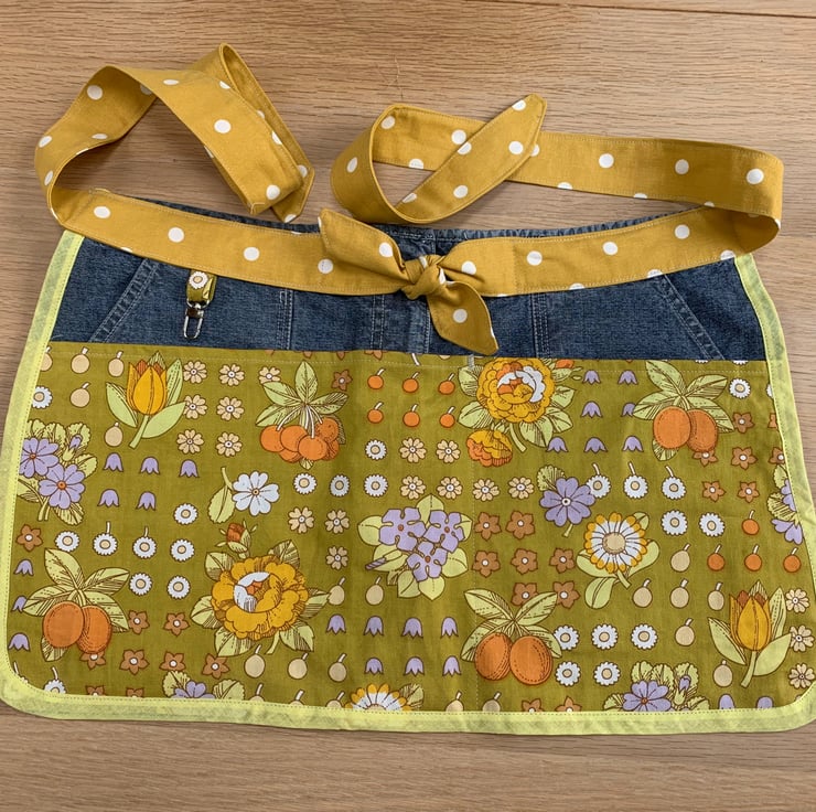 One of a kind apron or gardening tool belt made from reclaimed fabrics. The top of a pair of jeans forms the base and reclaimed Pat Albeck Cherry Pie curtain cotton makes the pockets. The ties are made from new spotty cotton. The apron is edged with bias binding.