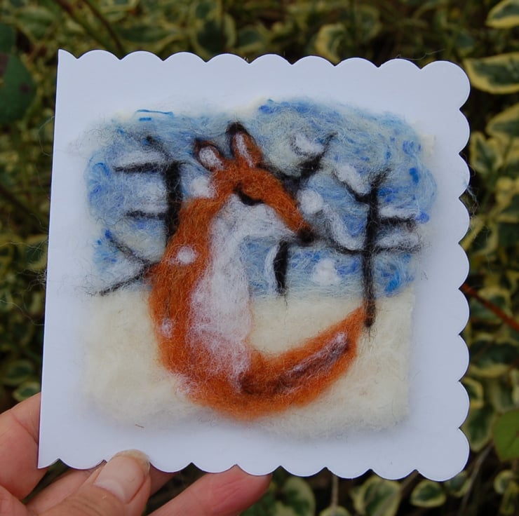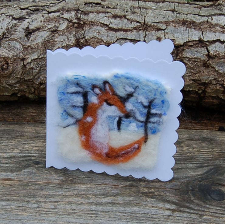 A card but is also a gift, as the fox is needle felted onto a piece of reclaimed wool blanket and lightly attached to a card. This can be removed and framed to make a lasting decoration.