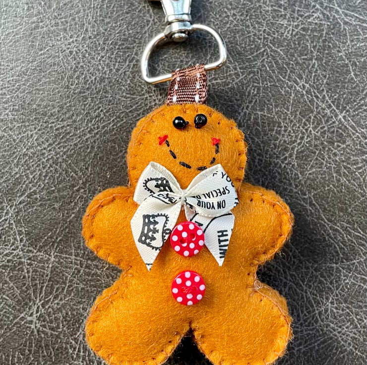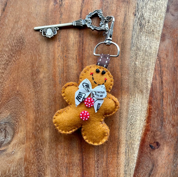 I luuurve my felt gingerbread decorations. They're fun to make and great to have hanging out in my house, but they're not very portable! This handcrafted little gingerbread man measuring just 7 cms from head to 'delicious' toe can travel everywhere with me.