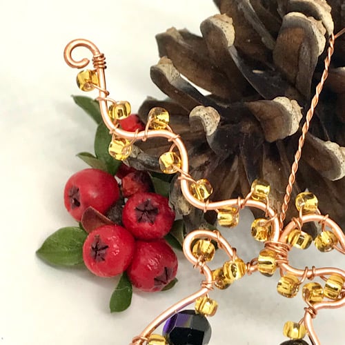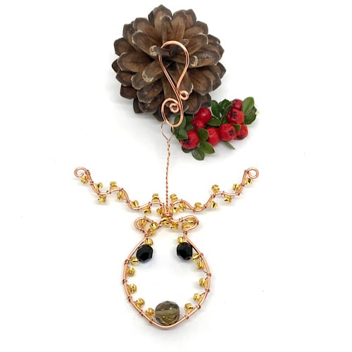 A very cute Reindeer Christmas hanging decoration handmade with copper wire and beads using wire wrapping techniques.