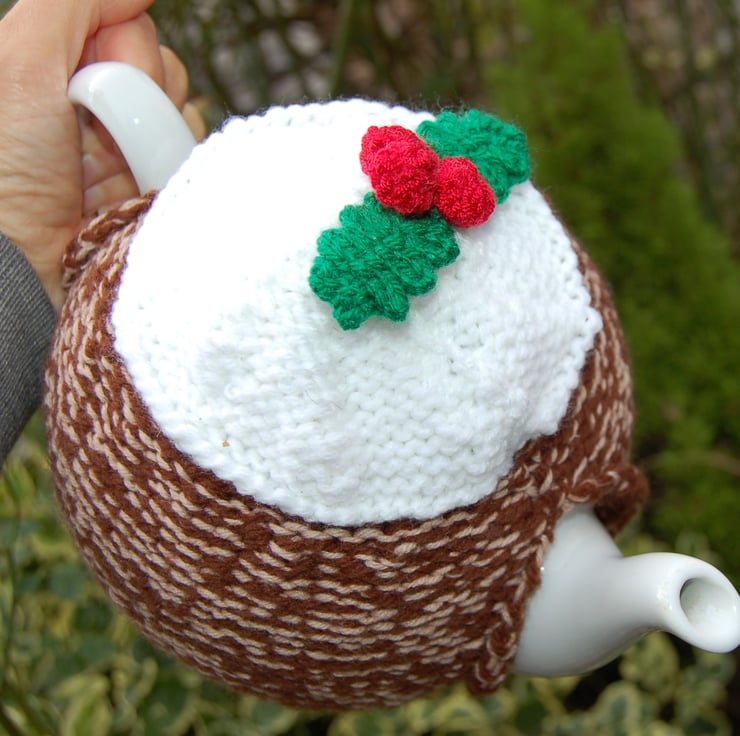 Knitted using two strands of acrylic yarn. Topped with a hand knitted spring of holly.