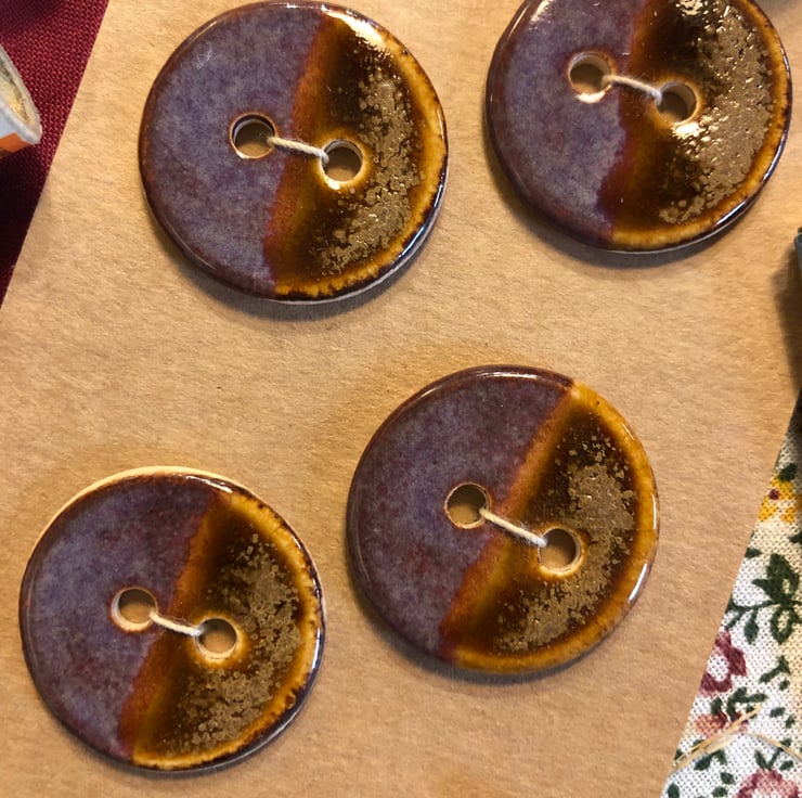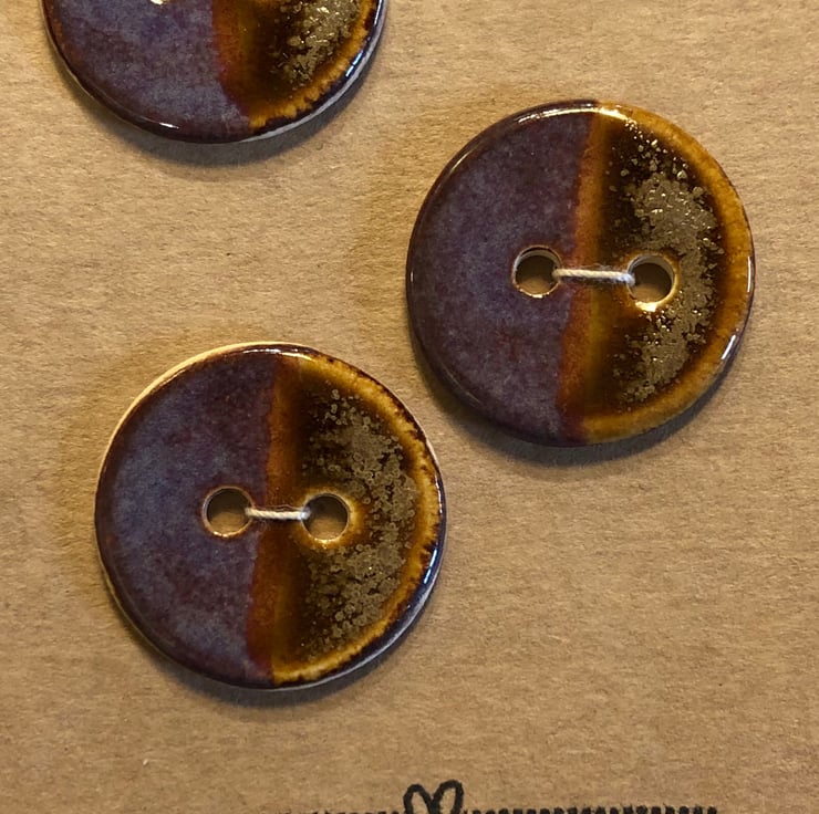 These round buttons were handcrafted and fired in my small home studio. They were glazed with two different glazes and slightly overlapped to produce a ‘half and half’ effect with a subtle stripe down the middle. One side is a smoky purple colour and the other is a textured effect amber (smooth to the touch). As each individual button is handcrafted, no two buttons will be exactly the same.