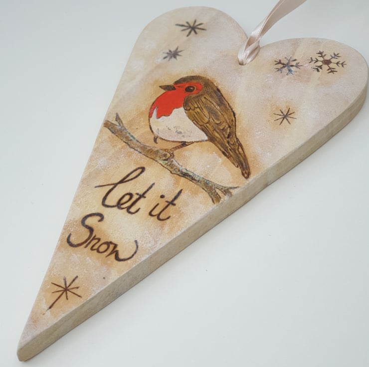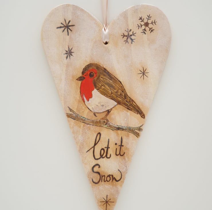 Pretty robin in the snow rustic wooden hanging heart decoration. The heart has been handmade from a piece of reclaimed pine and decorated with a Christmas robin using the art of pyrography and the words "let it snow" . The design has then been brought to life with acrylic paints. A hole has been drilled in the top and a length of pretty coordinating ribbon added to hang it from.
