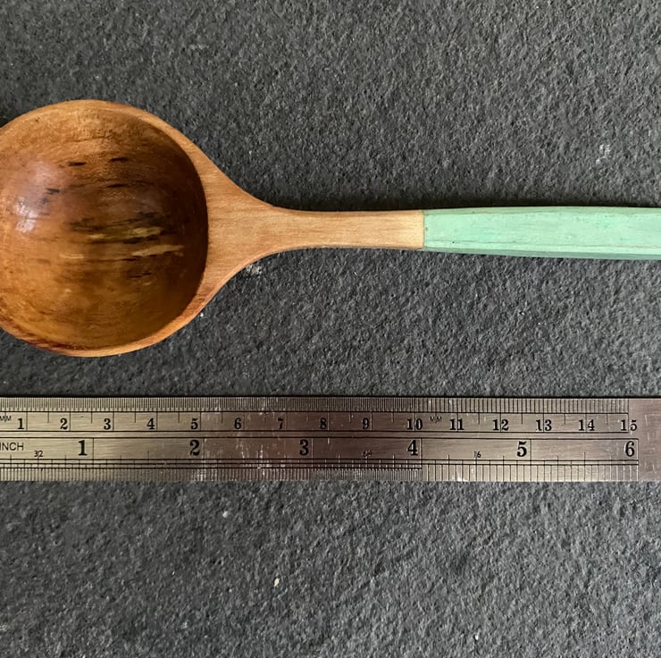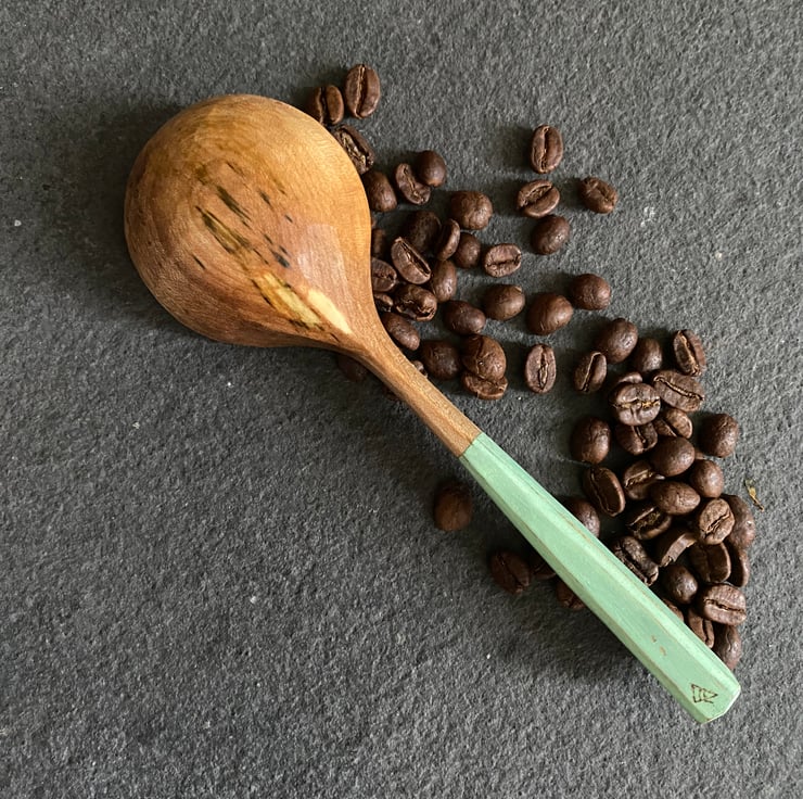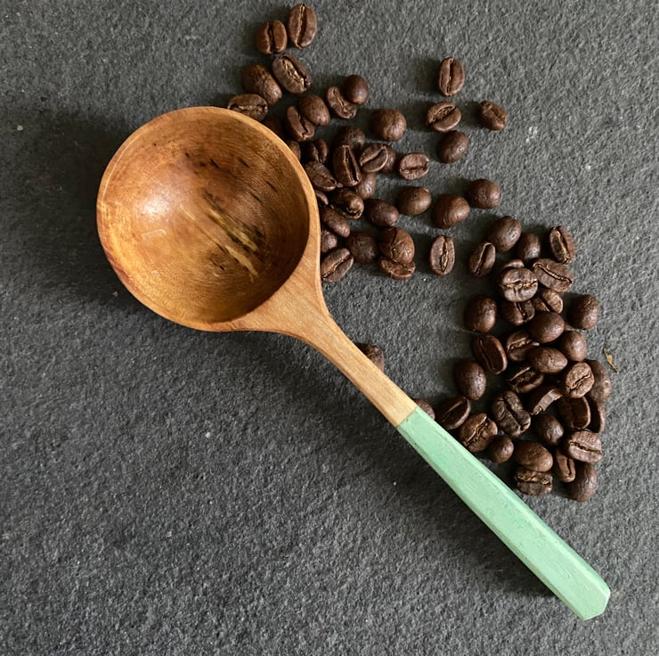 This generous Sycamore wood scoop holds 1.5Tbsp as a level measure or over 2Tbsp if heaped, perfect for coffee, loose tea, sugar or similar. The lovely bright willow milk paint of the handle contrast well with the rich wood colour, and shines over a base layer of tavern green just subtly peeking through. The handle length allows filling from even a deep storage pot but not so big it won’t be able to live in with your coffee or loose tea in the container.