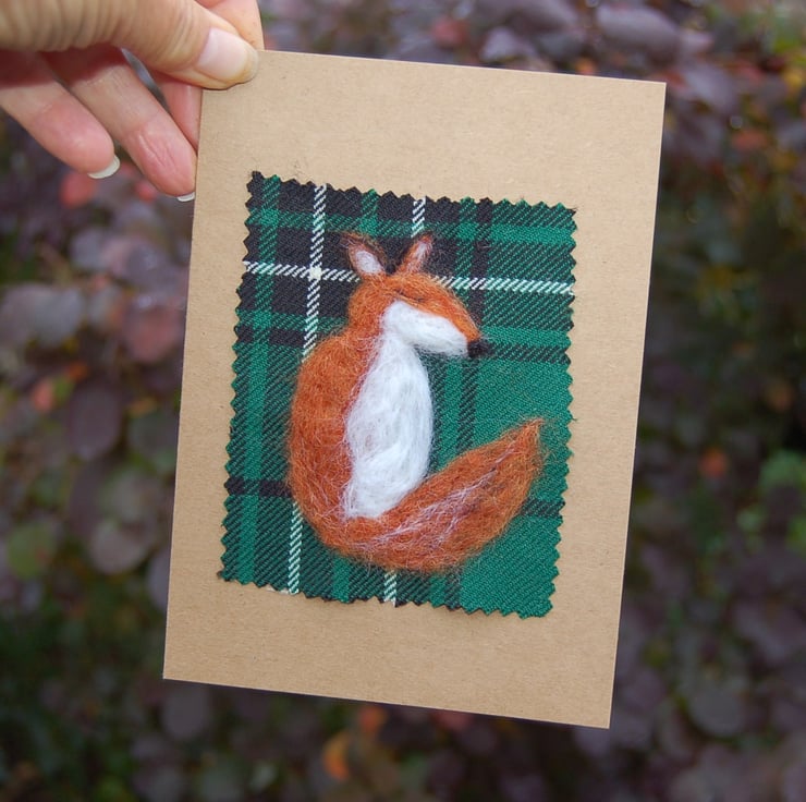 The fox has been needlefelted onto a piece pure wool Scottish Tartan and lightly attached to the card with glue strips making it easy to remove for framing.
