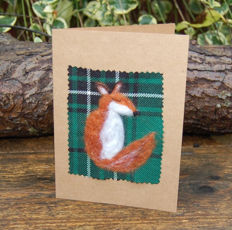 A card decorated with a fox made by needlefelting unspun fibre onto a piece of pure wool Scottish Tartan.
