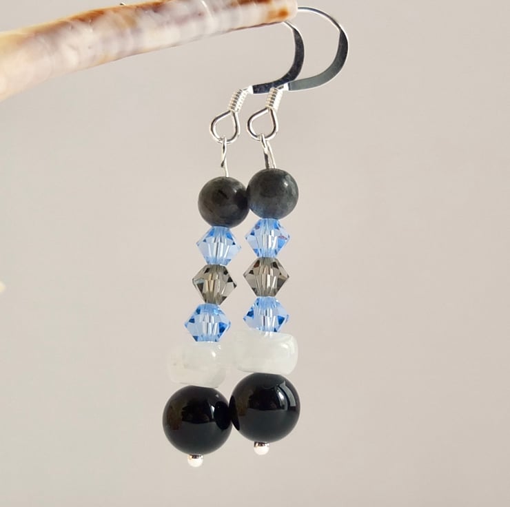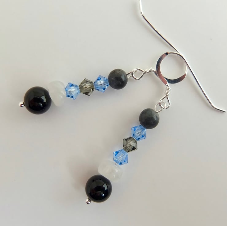 Each earring features the following beads: 6mm black onyx, 5mm moonstone nugget, 2x Swarovski "light sapphire" 4mm bicones, Swarovski "black diamond" 4mm bicone and 4mm labradorite.