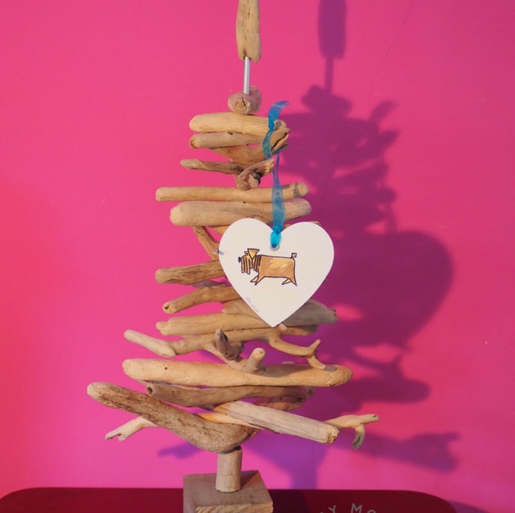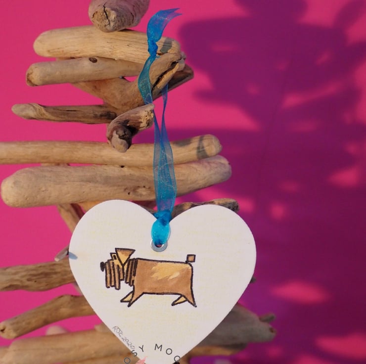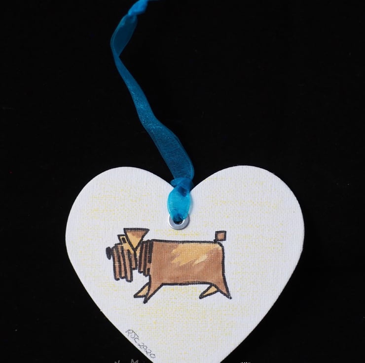 A hand drawn decoration featuring a Great British Bulldog which will look great on the wall or Christmas tree. The heart measures approximately 10x10cm, is sprayed with a fixative to prevent smudging and fading. The decoration is hung using a blue ribbon.