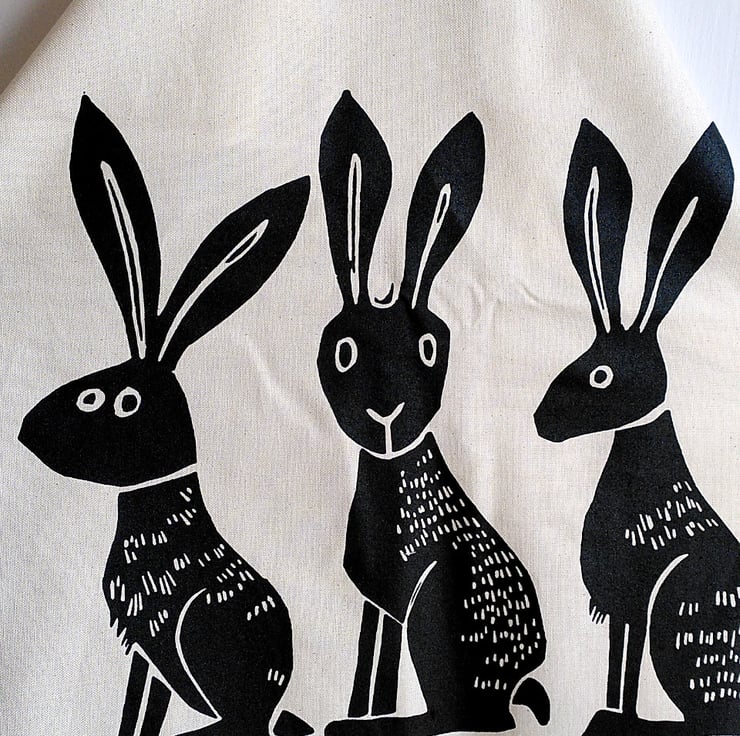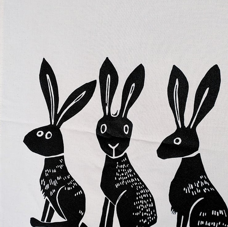 Three bold striking Hares on a lovely soft organic, unbleached cotton tea towel.