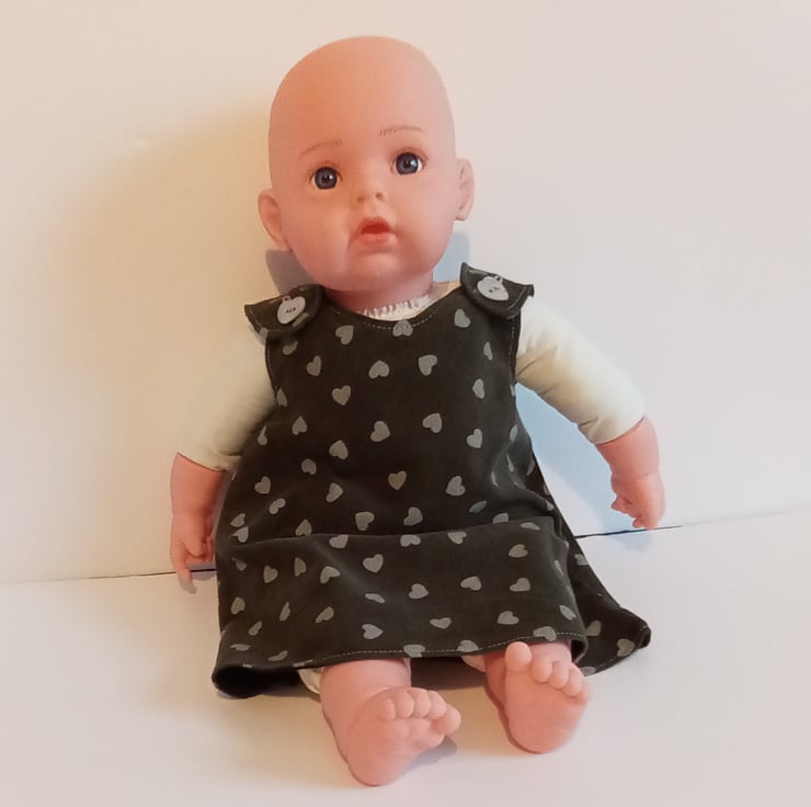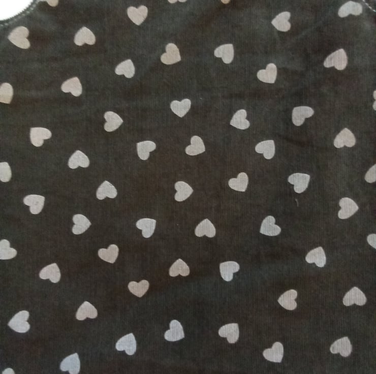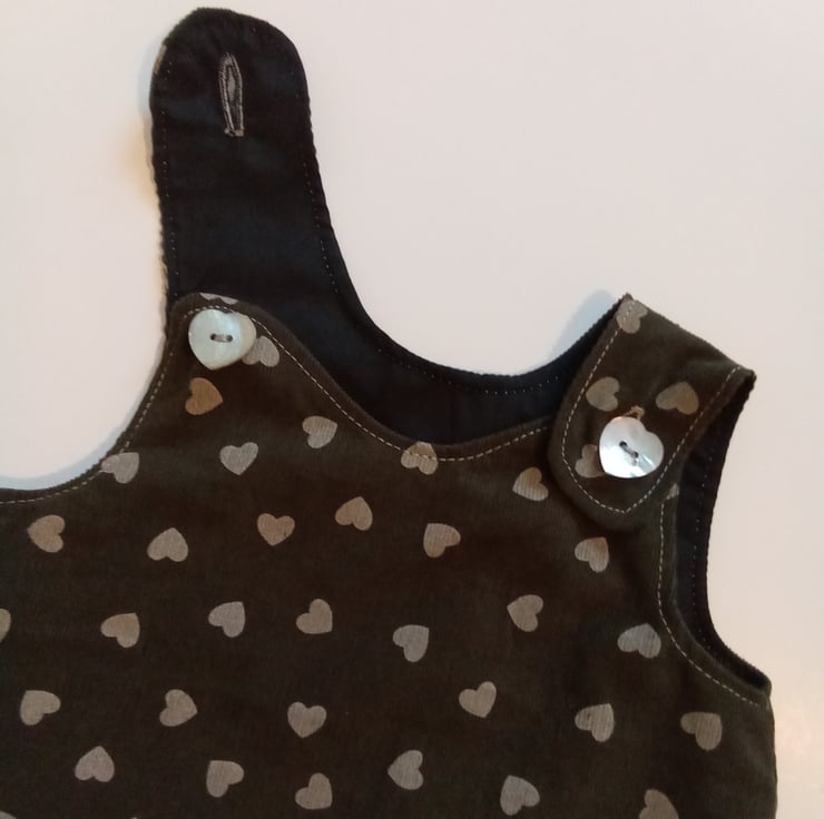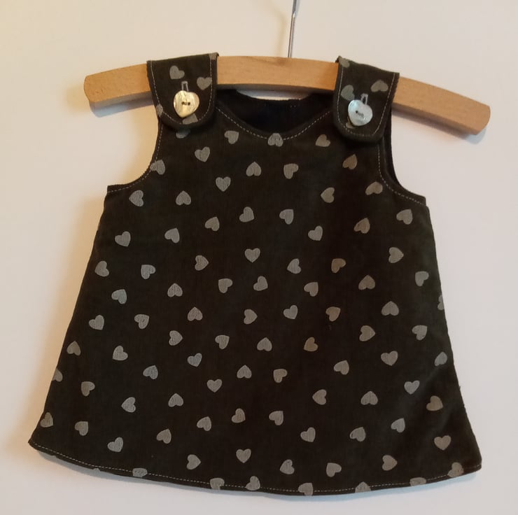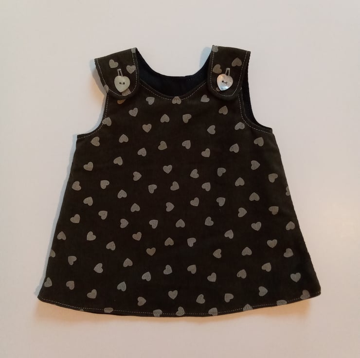 A line style dress/pinafore in a Charcoal grey needlecord with a light grey heart design and mother of pearl heart buttons. Fully lined in black polycotton.