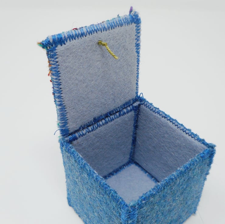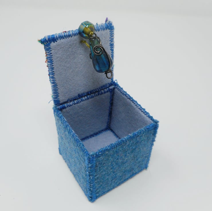 The box is fully lined in wool felt in a co-ordinating light blue colour. Glass beads are used with a loop of matching thread to weigh down the lid.